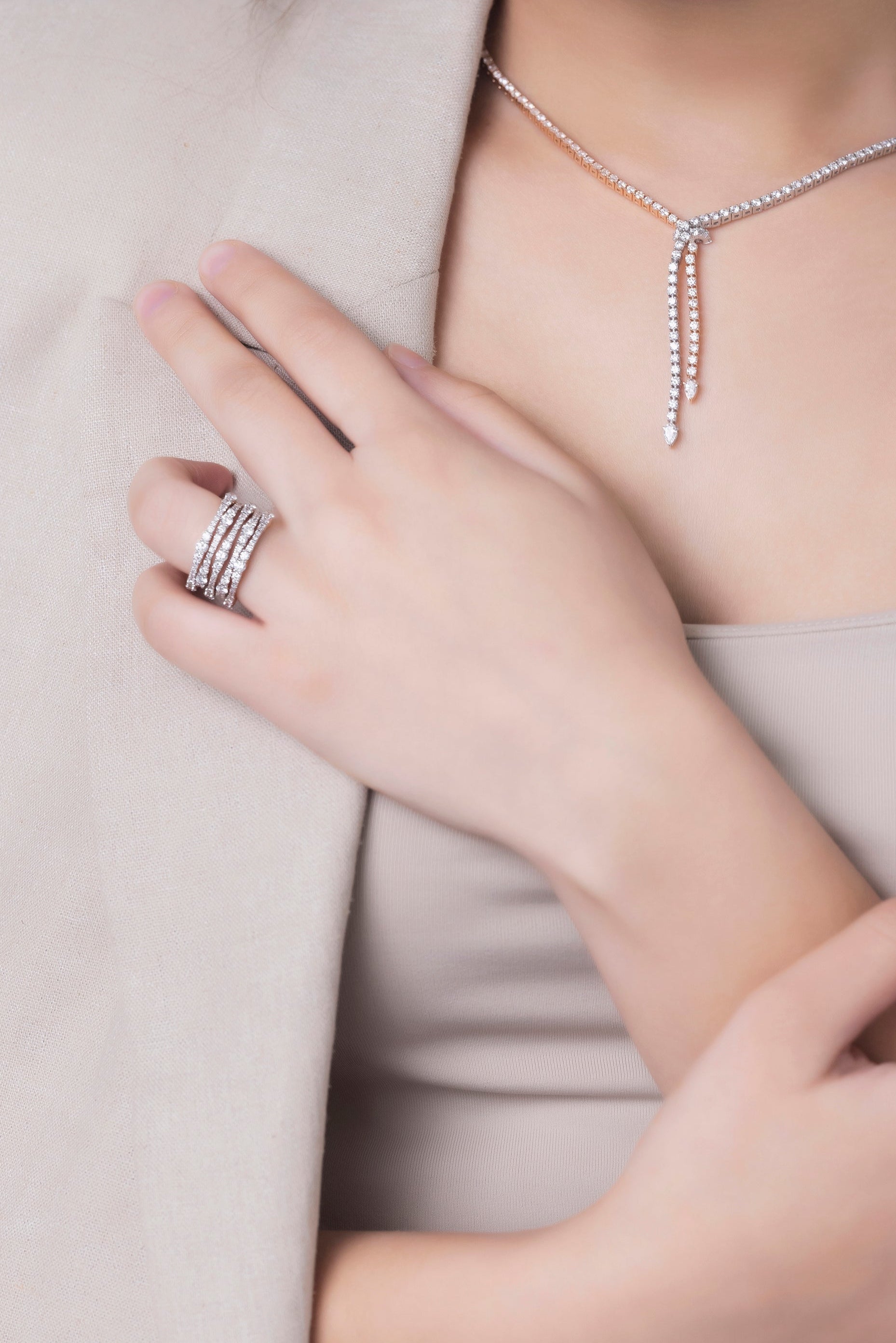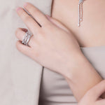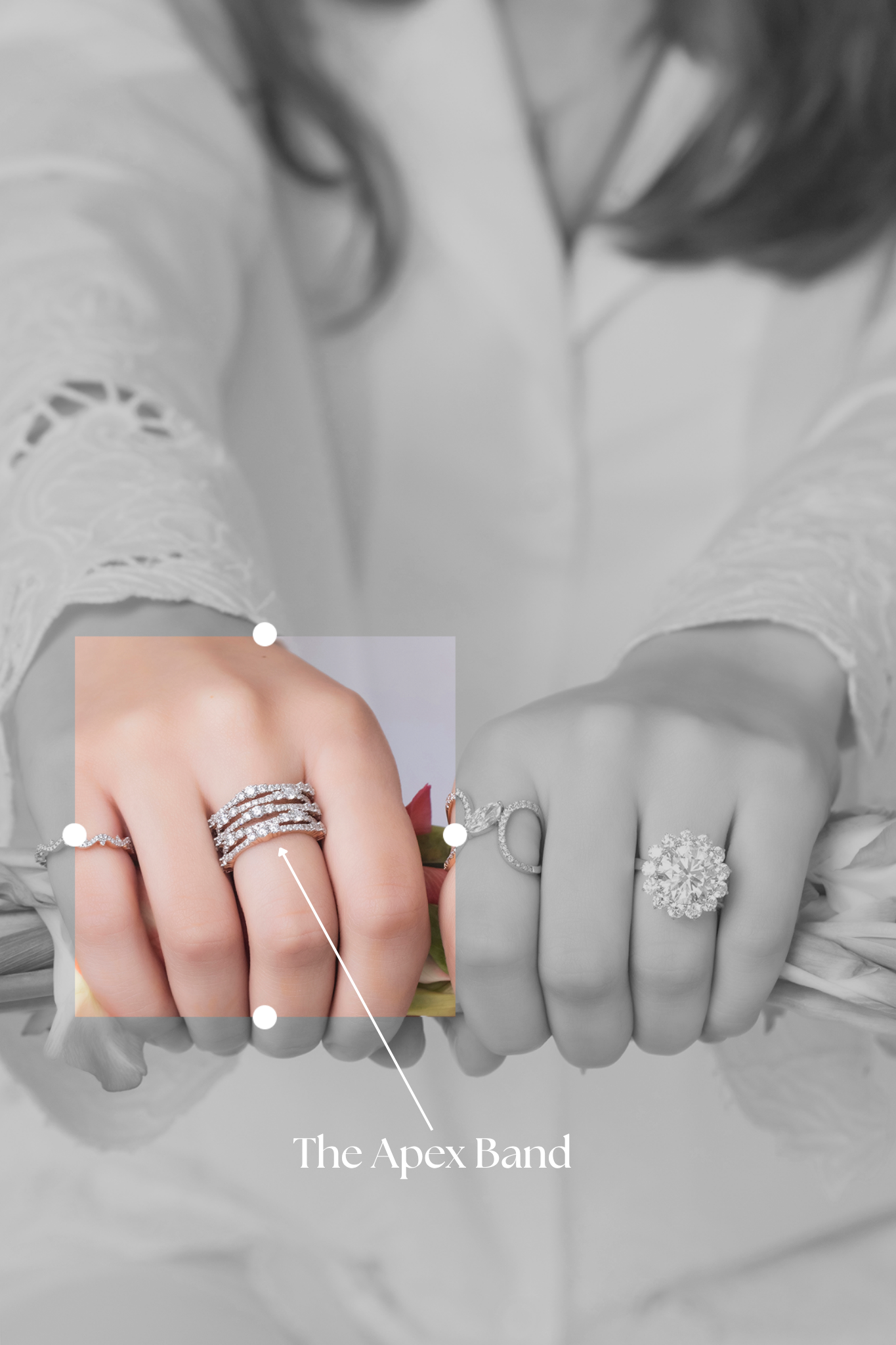 The Apex Band features multiple rows of Lab grown diamonds stacked in a striking silhouette, crafted in polished 14K white gold. Its tiered design creates the illusion of a built-in stack while delivering dimension, structure, and serious sparkle.