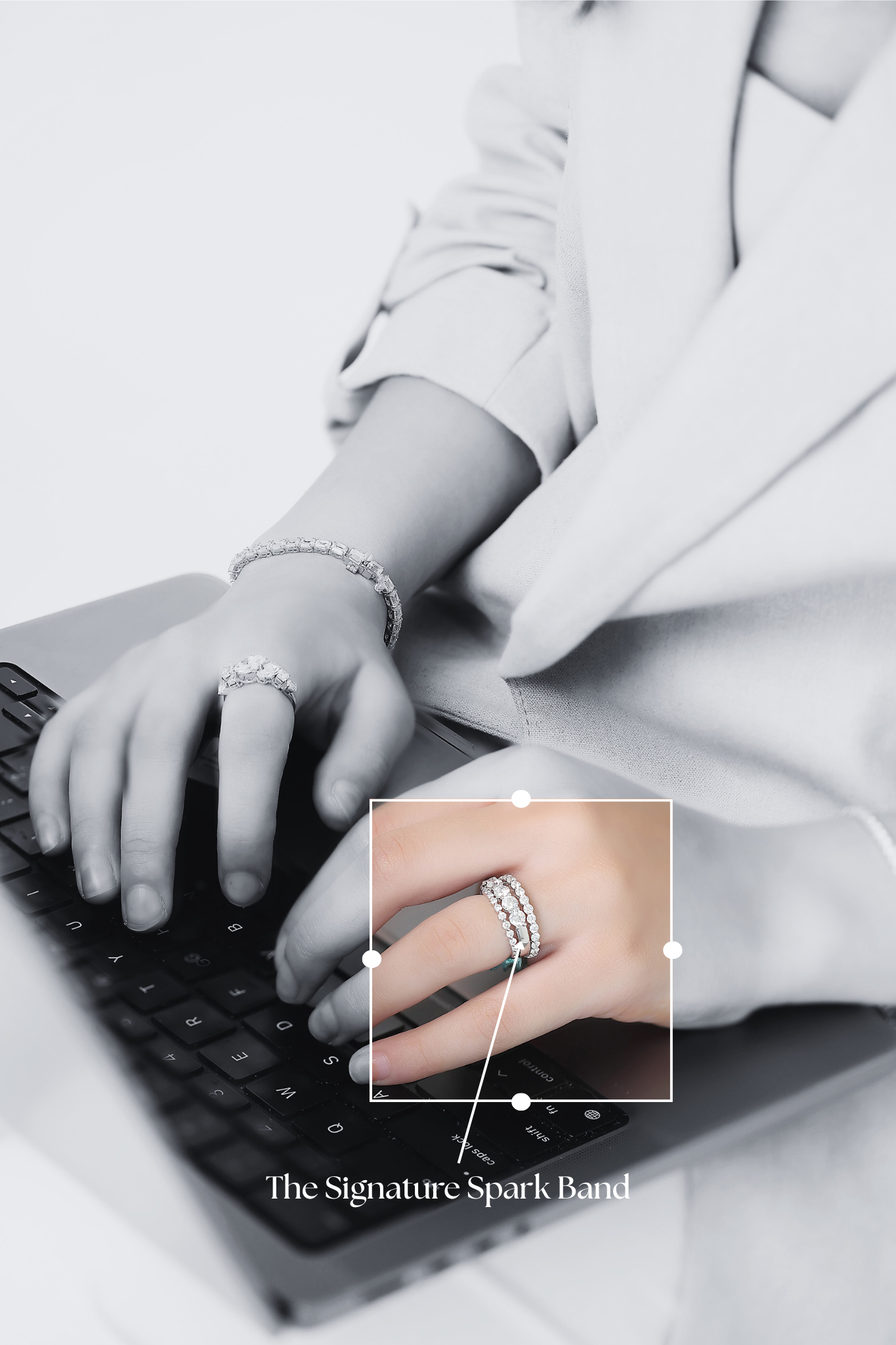The Signature Spark Band showcases a row of perfectly matched round brilliant Lab grown diamonds, prong-set across the top of a polished 14K white gold band. Designed for effortless stacking or solo sparkle, this piece brings timeless elegance to your daily uniform or your forever stack.