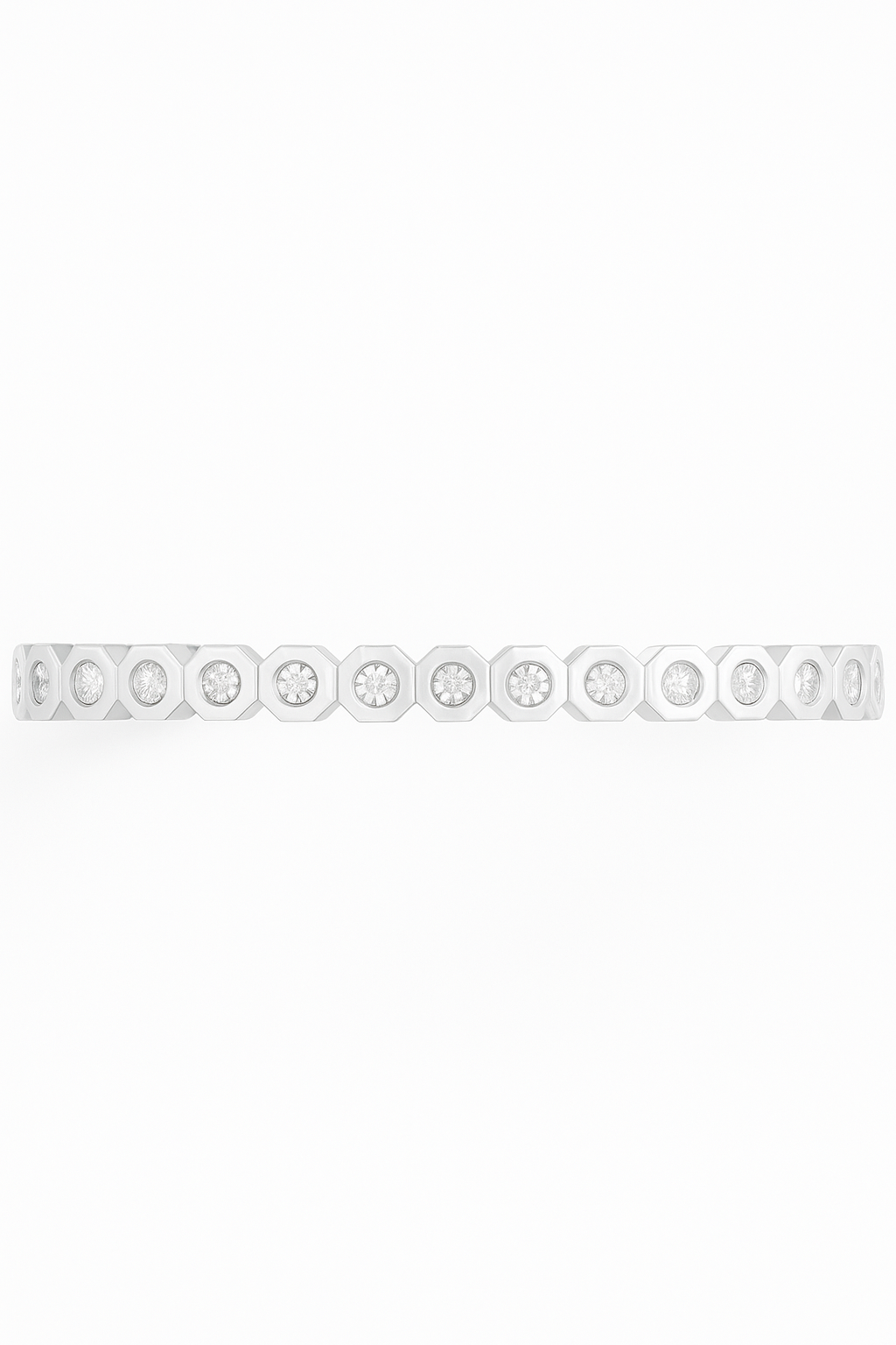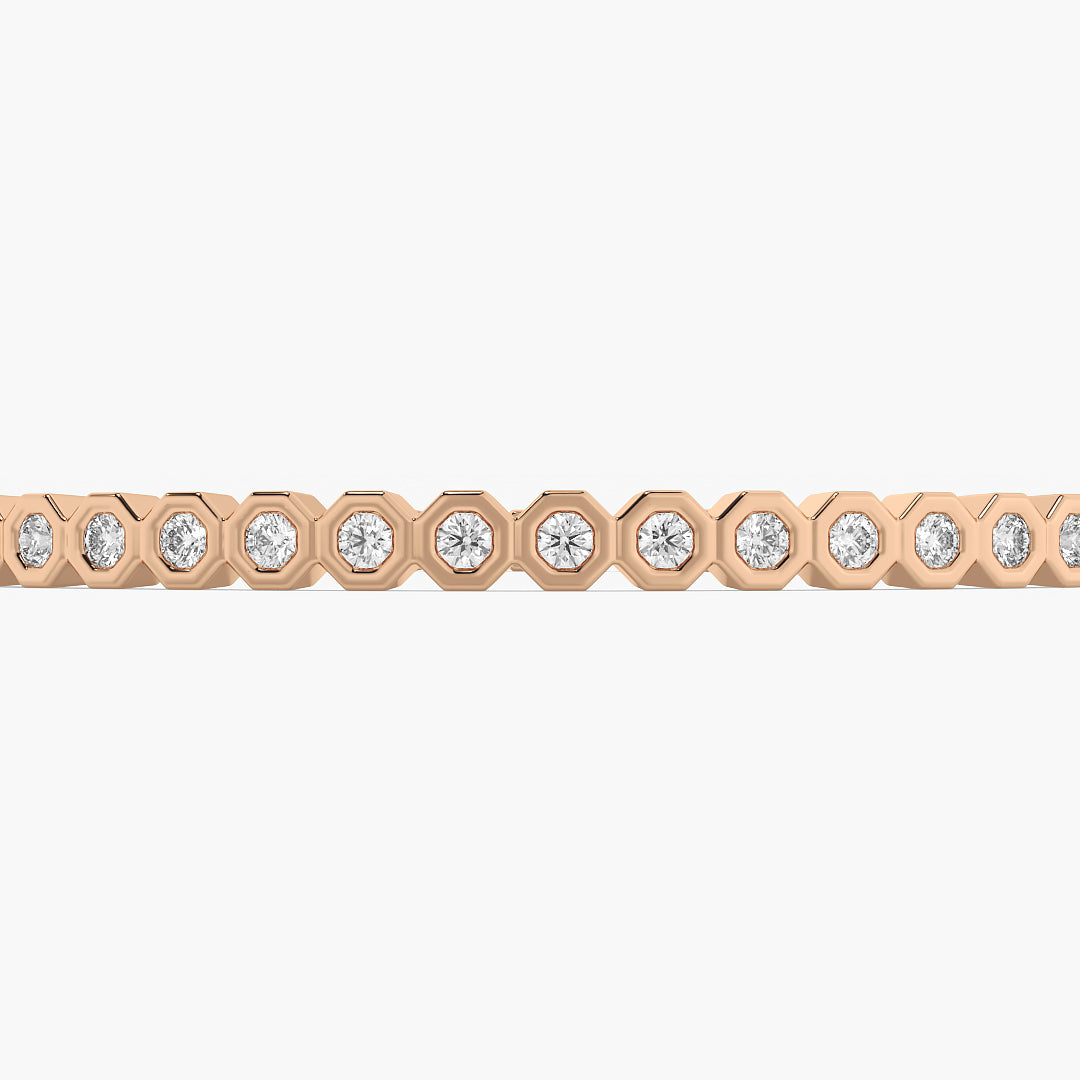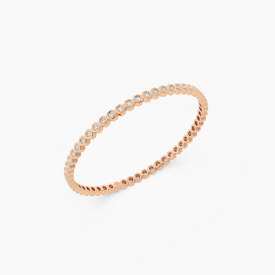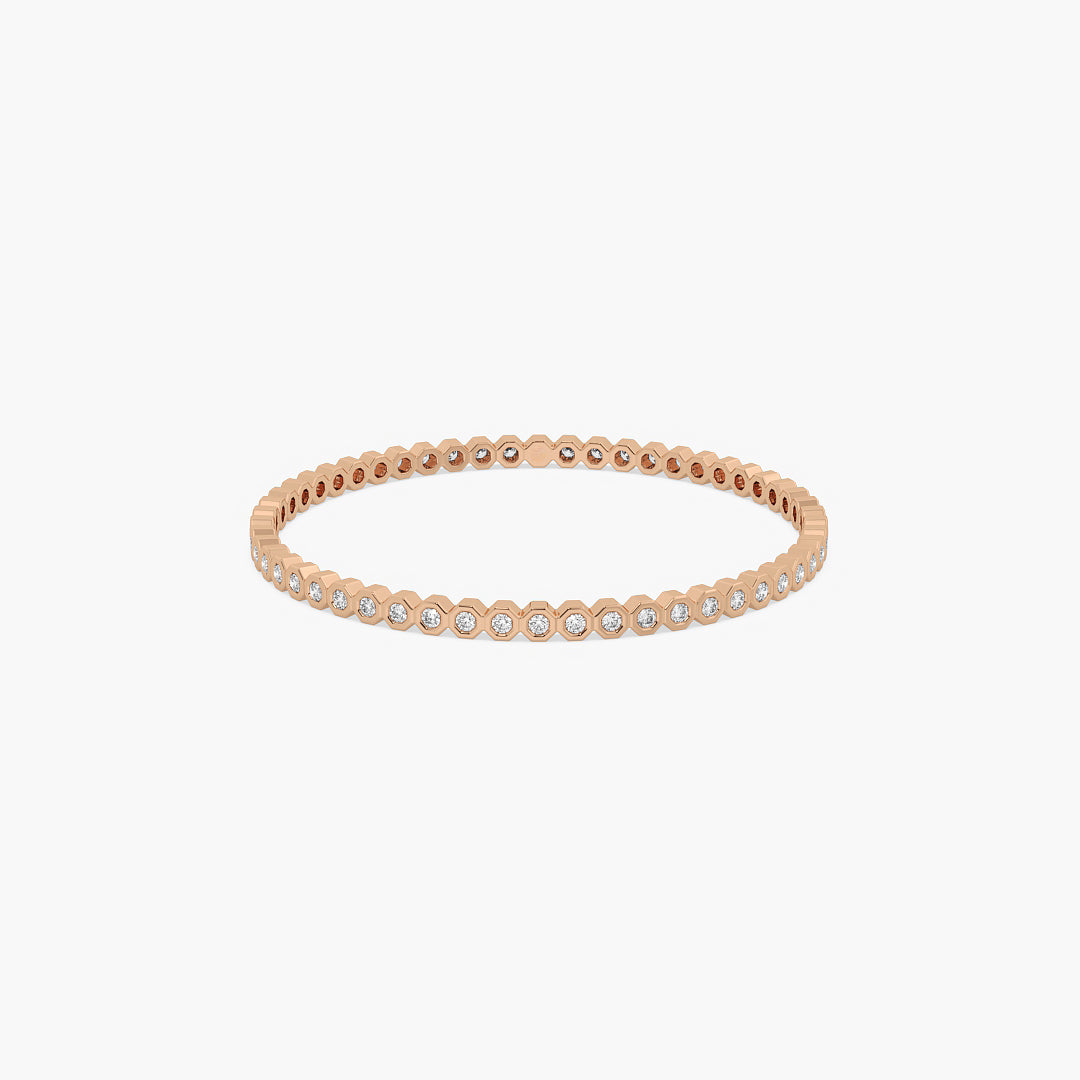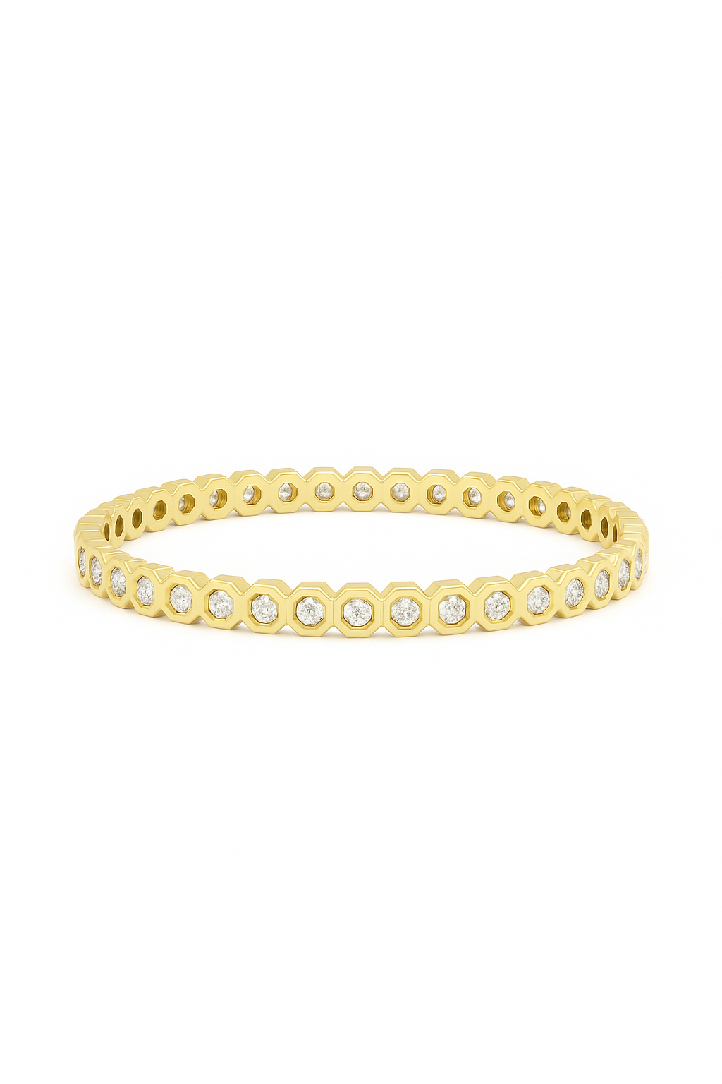 Modern with a geometric edge, the Hexa Bezel Diamond Bangle features round brilliant Lab grown diamonds set in a continuous hexagon bezel design. Crafted in warm 14k gold, this statement stacker adds texture and dimension to your wrist — bold enough to wear solo, subtle enough to stack endlessly.