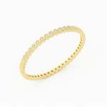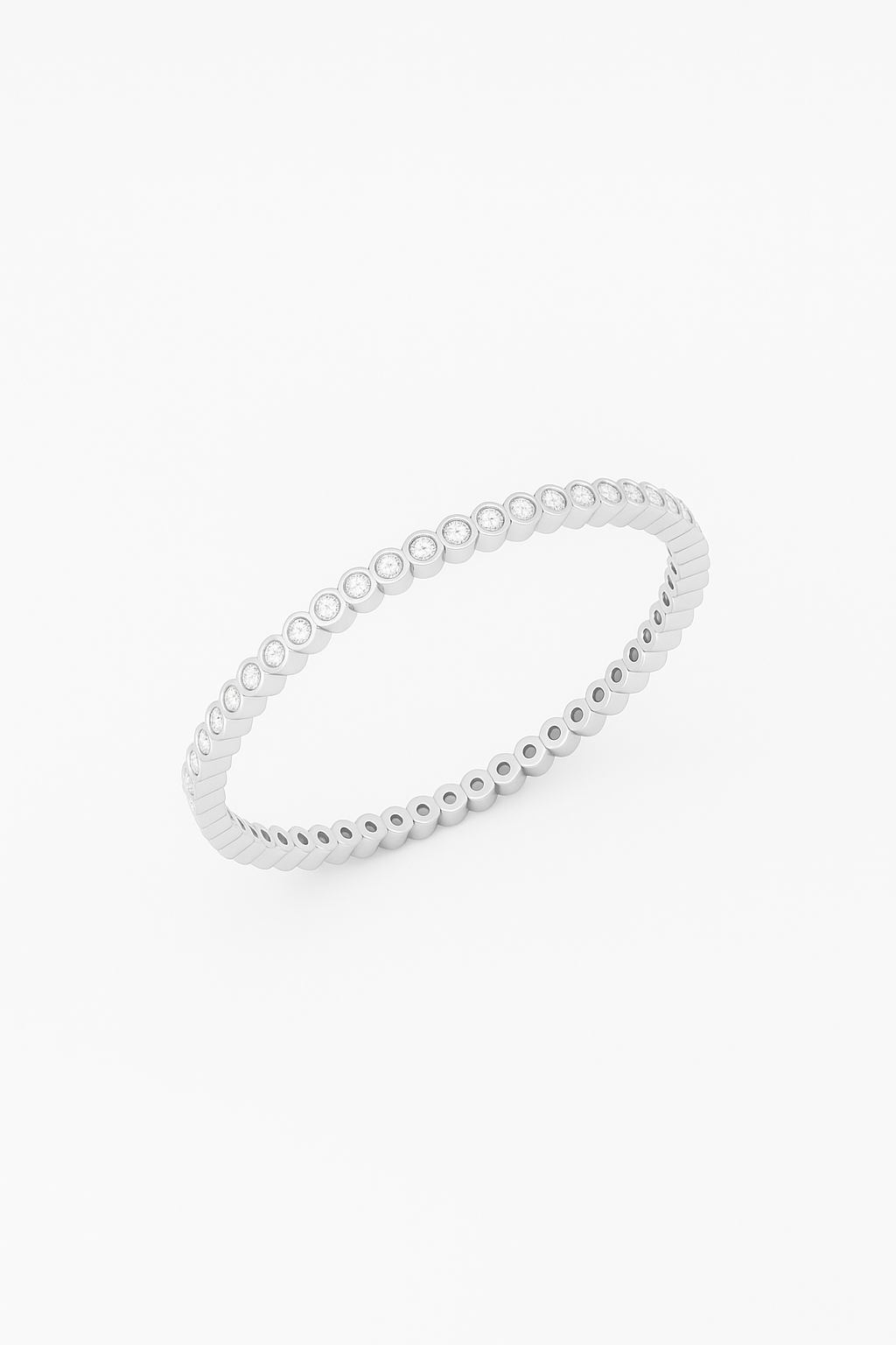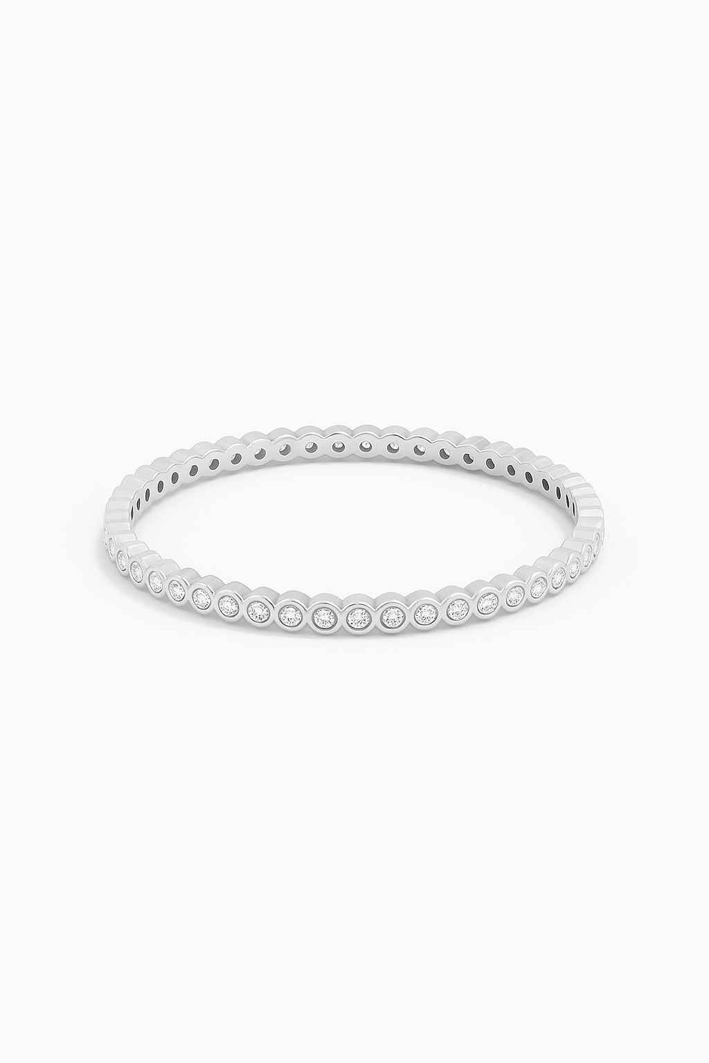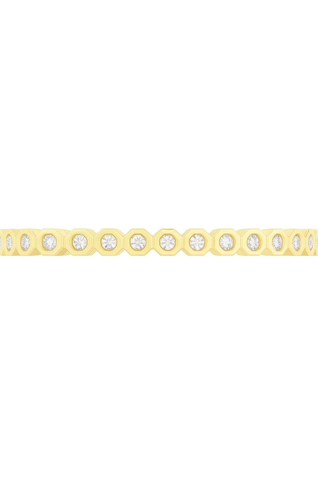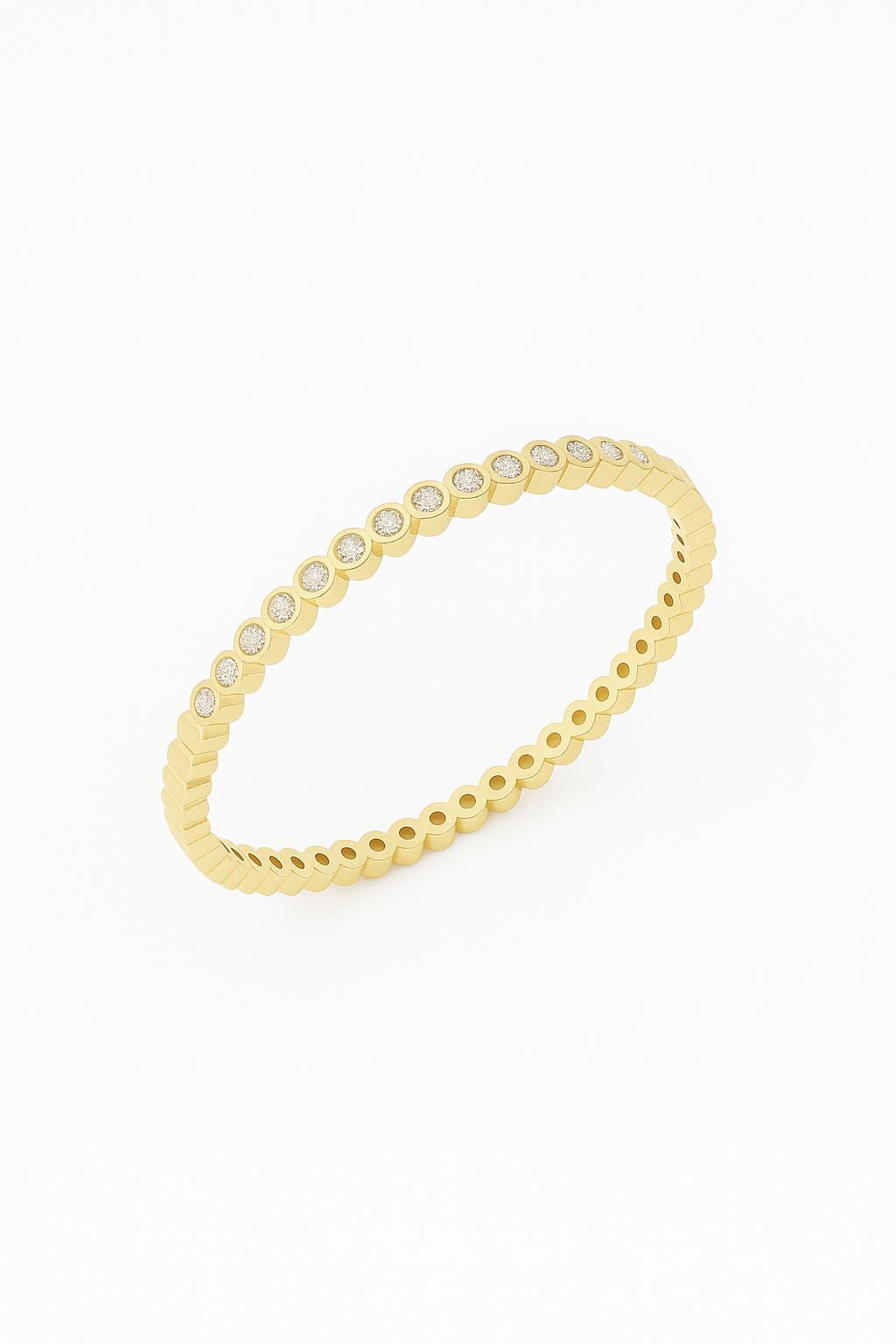 Modern with a geometric edge, the Hexa Bezel Diamond Bangle features round brilliant Lab grown diamonds set in a continuous hexagon bezel design. Crafted in warm 14k gold, this statement stacker adds texture and dimension to your wrist — bold enough to wear solo, subtle enough to stack endlessly.