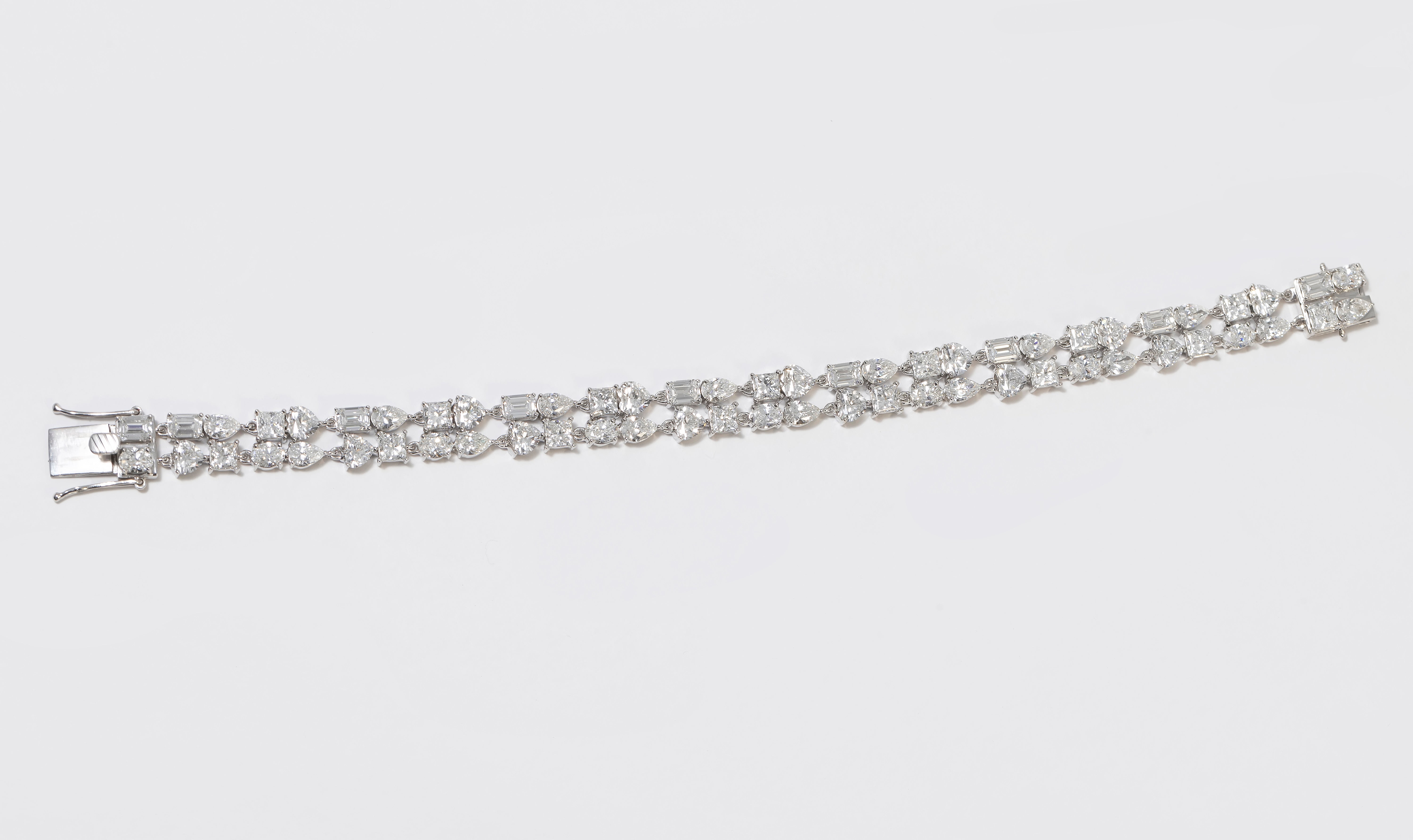 This striking bracelet combines pear-shaped, heart, oval, and cushion-cut lab-grown diamonds, arranged in a unique and asymmetrical design. Set in 14K gold, its distinct cut variations add depth and character, making it a perfect statement piece.