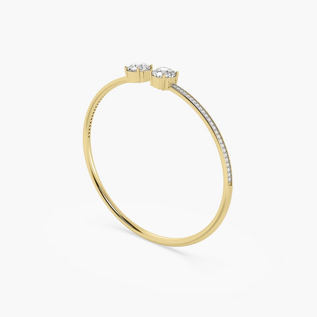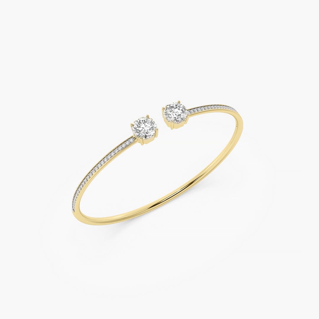 The Twin Solitaire Open Bangle features two round brilliant Lab grown diamonds facing each other on a slim 14k band accented with a pavé diamond row. Clean lines and maximum sparkle meet in this refined, modern take on the classic cuff.