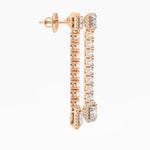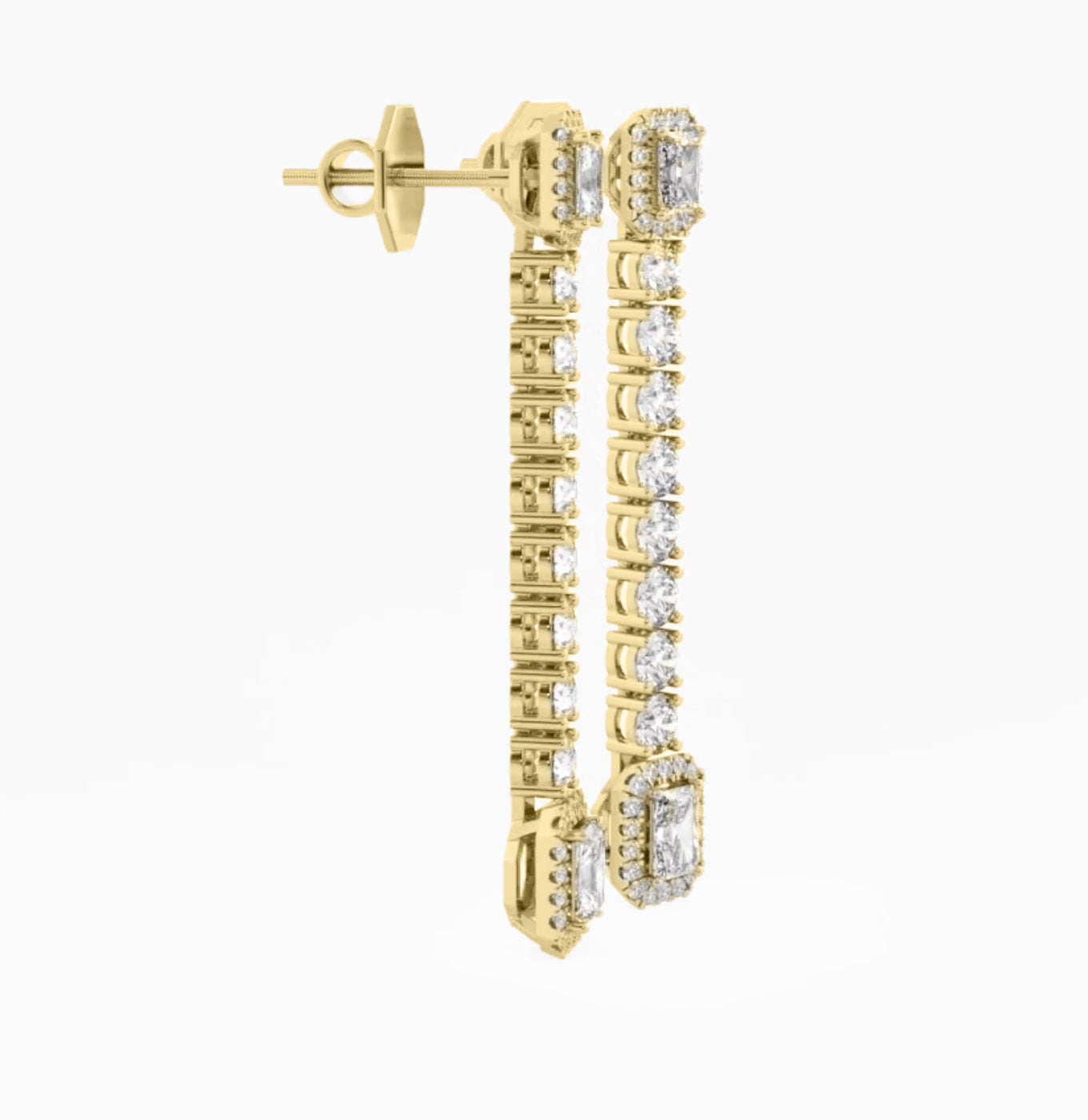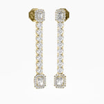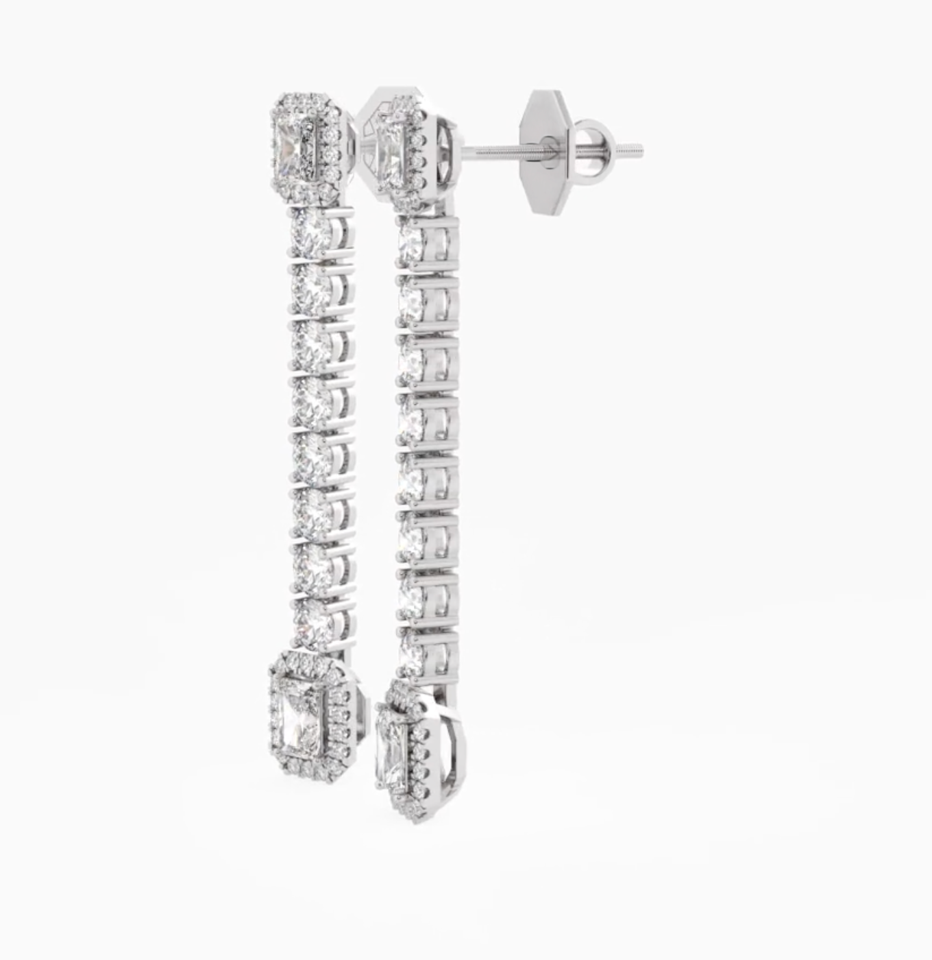 The Emerald Drop Line Earrings are a striking blend of elegance and edge. Featuring a vertical row of round brilliant Lab grown diamonds anchored by a sparkling emerald-cut diamond halo at each end, these earrings deliver maximum movement, brilliance, and glamour.