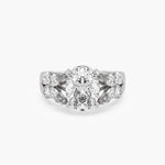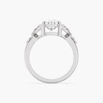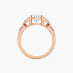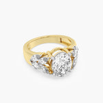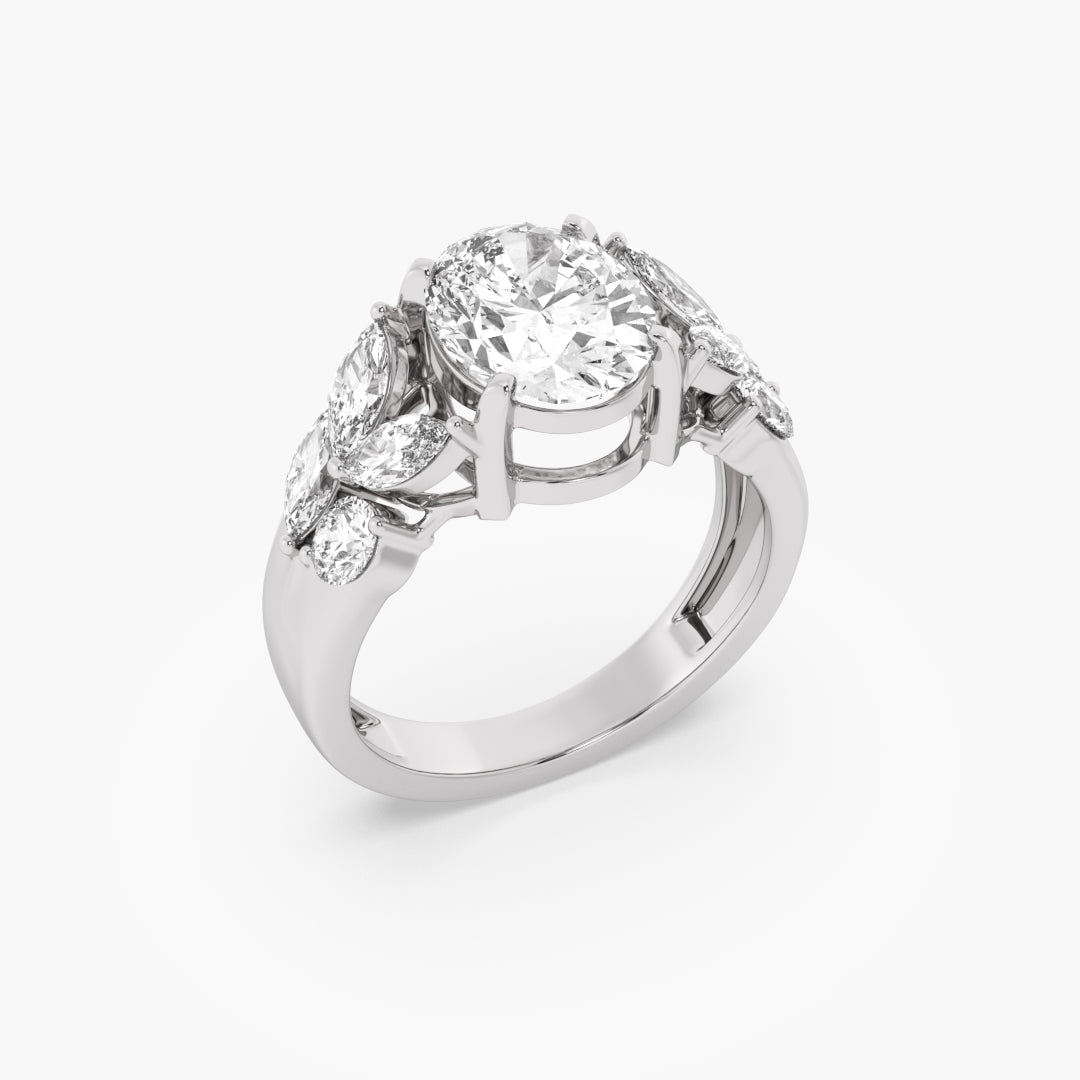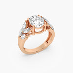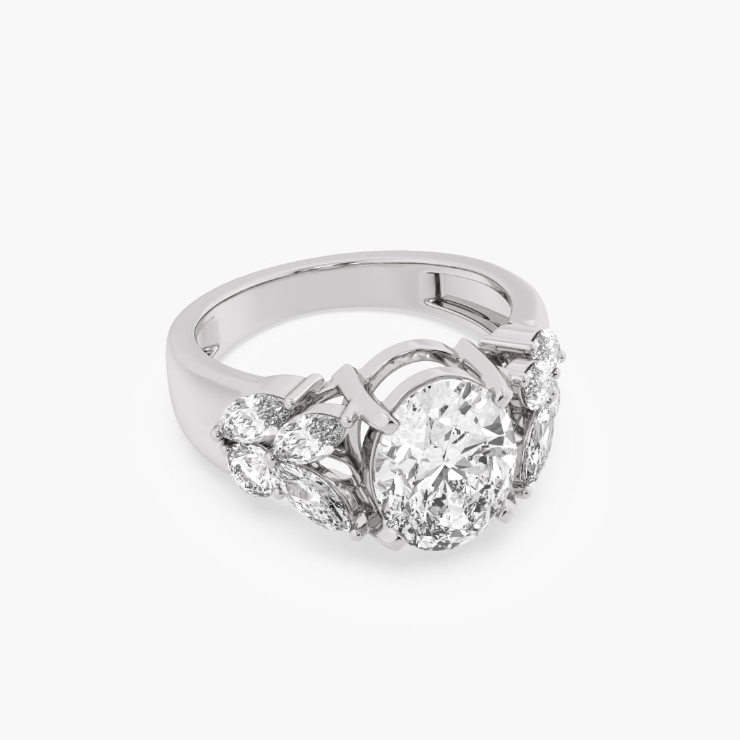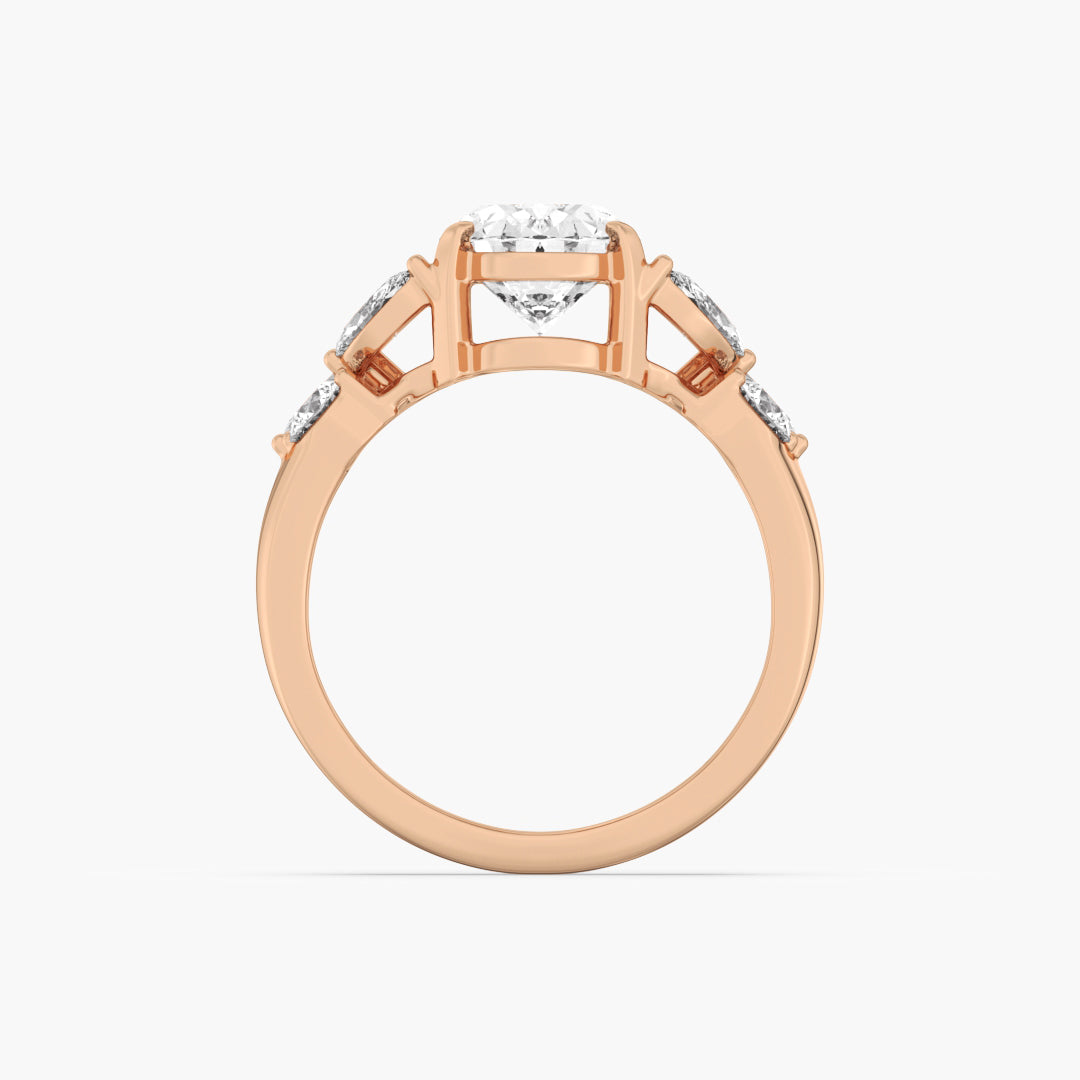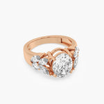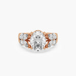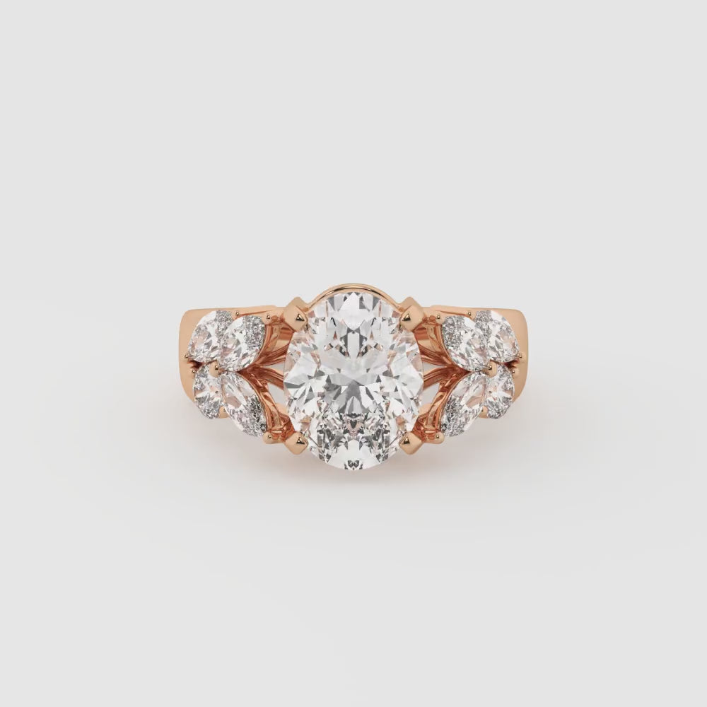 A lab grown oval center diamond accented by four marquise-cut lab grown diamonds set in 14k rose gold for a graceful, floral-inspired design.