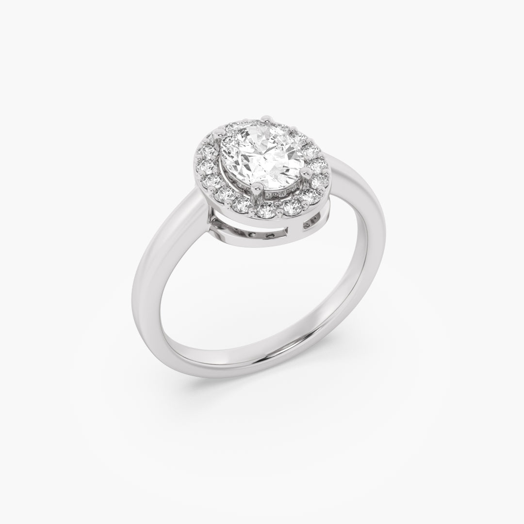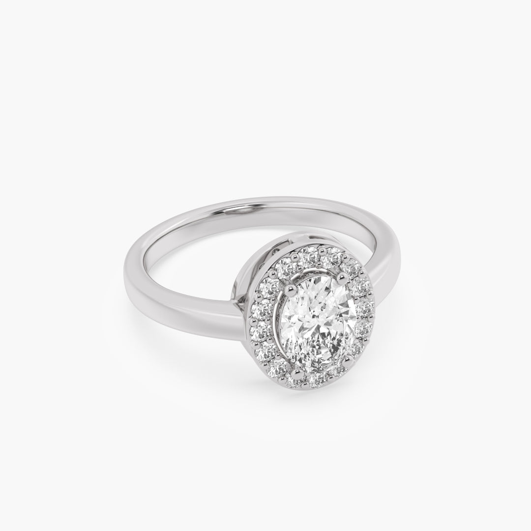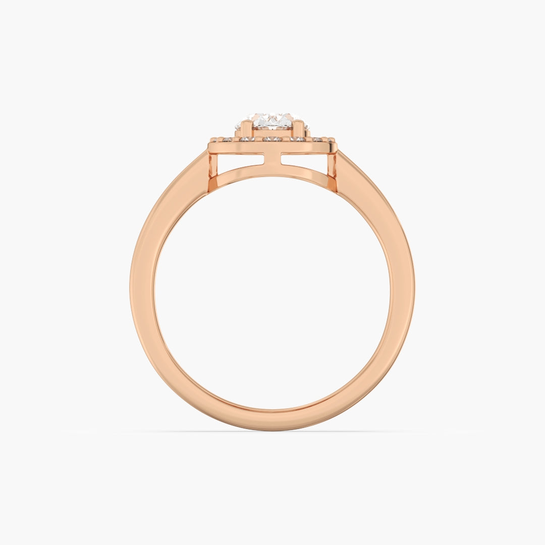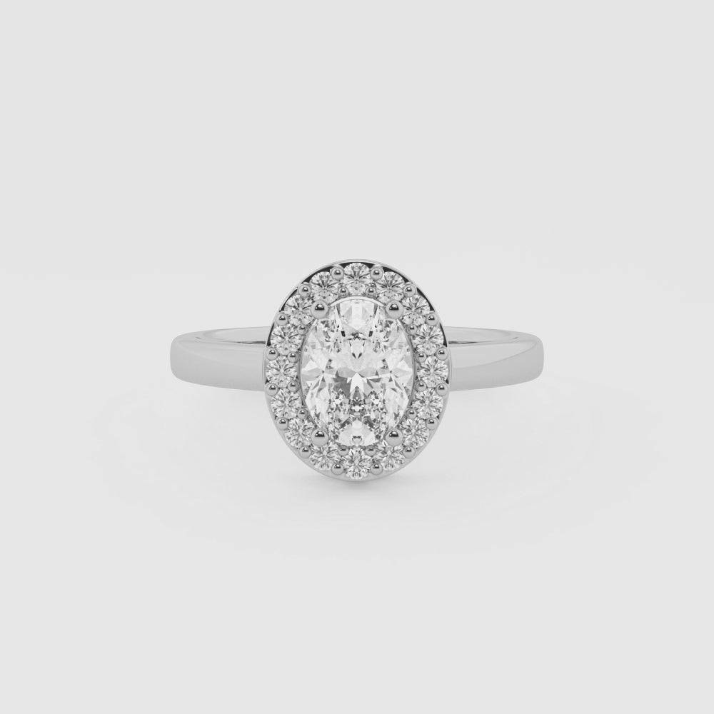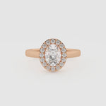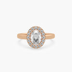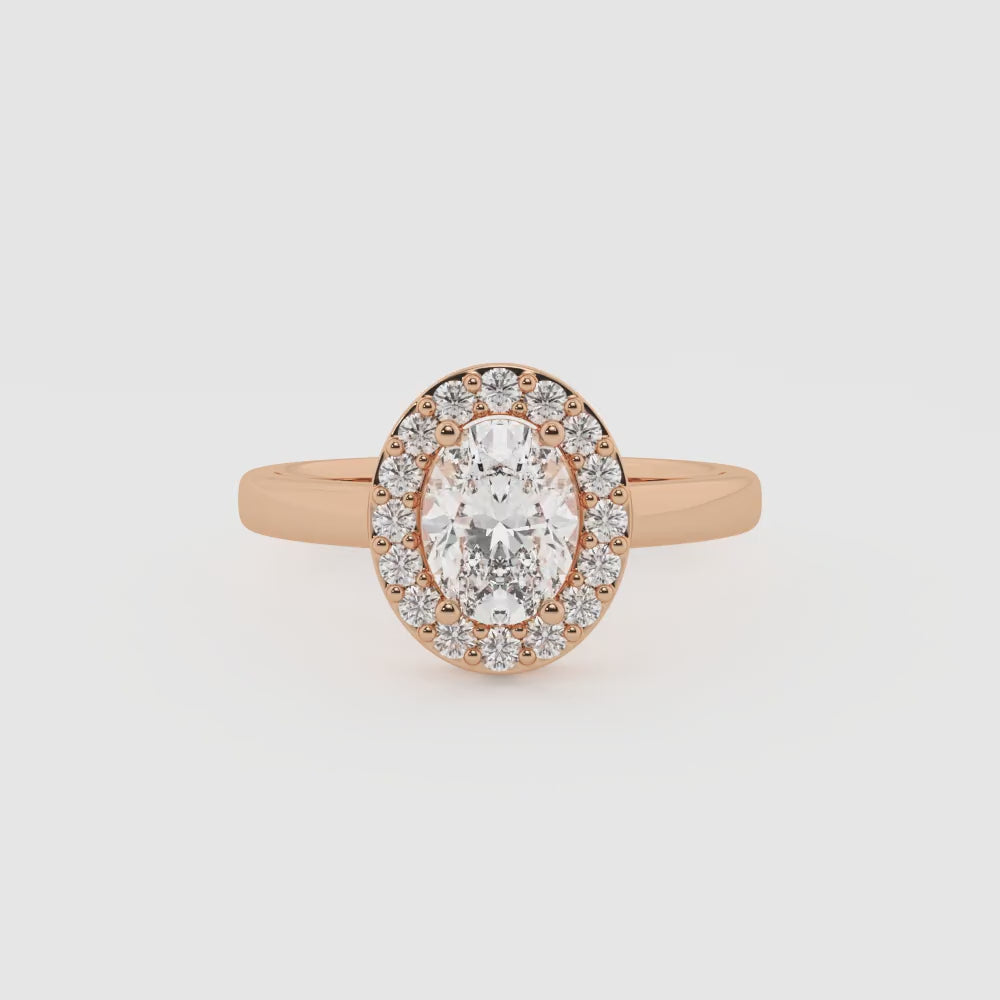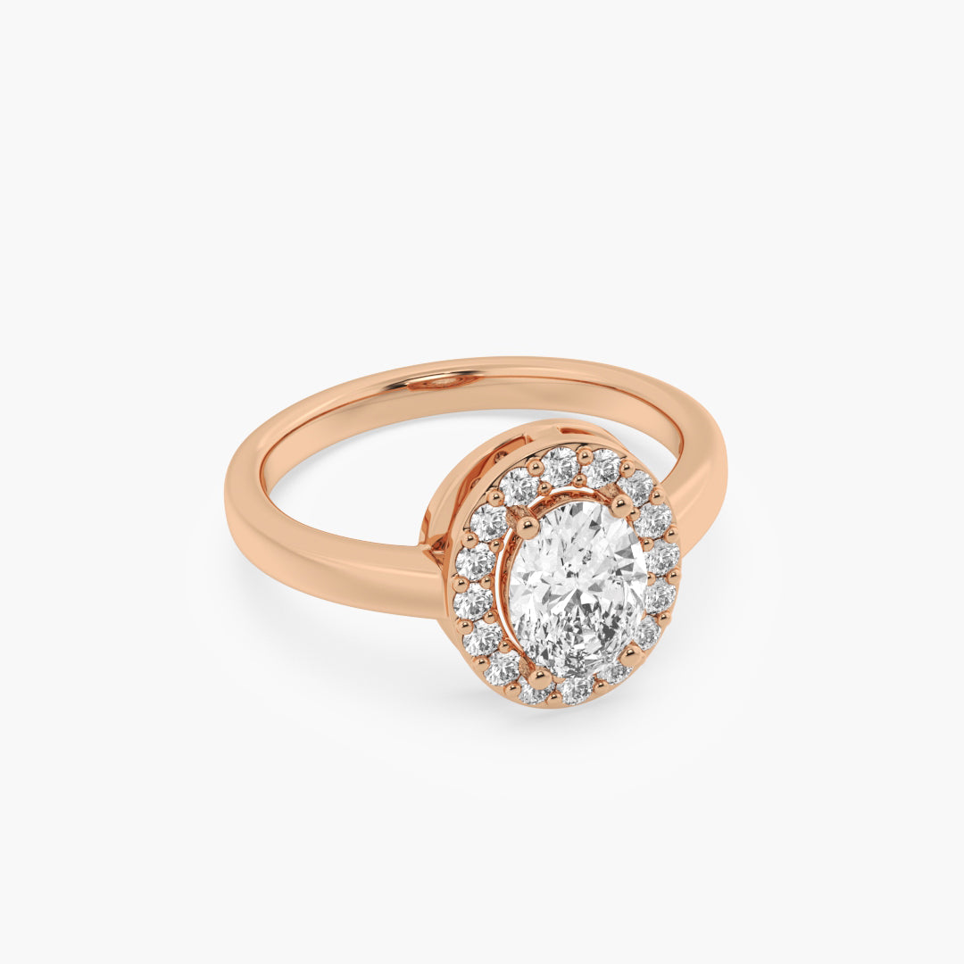 A lab grown oval diamond encircled by a delicate pavé halo, set on a slender 14k rose gold band for a soft, romantic sparkle.