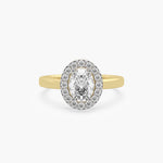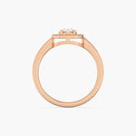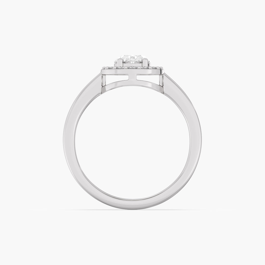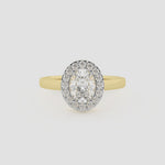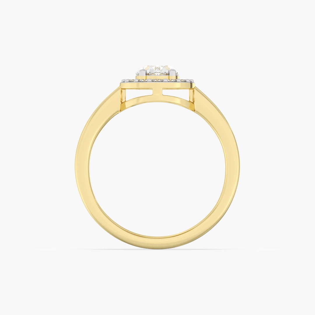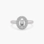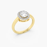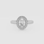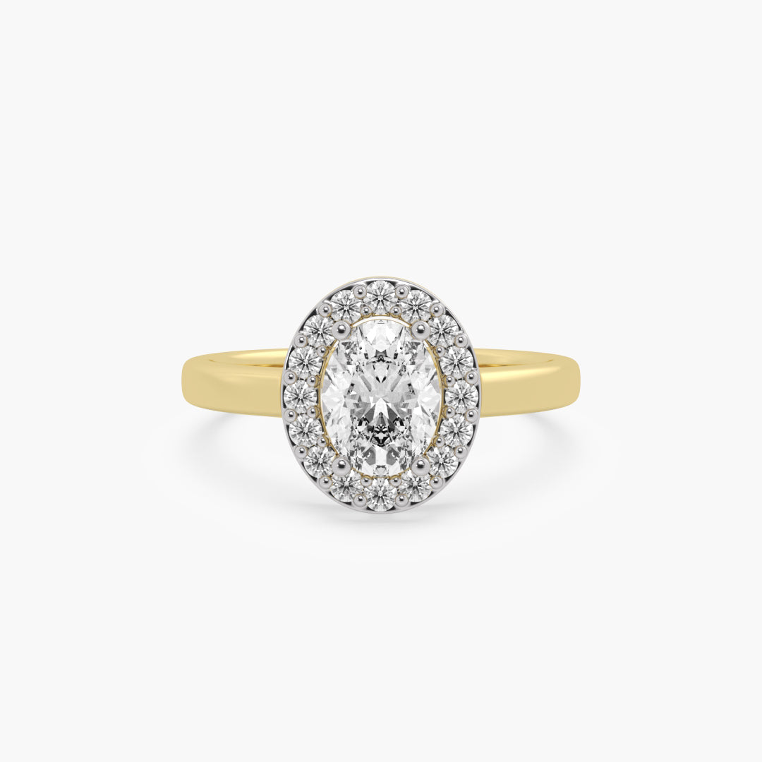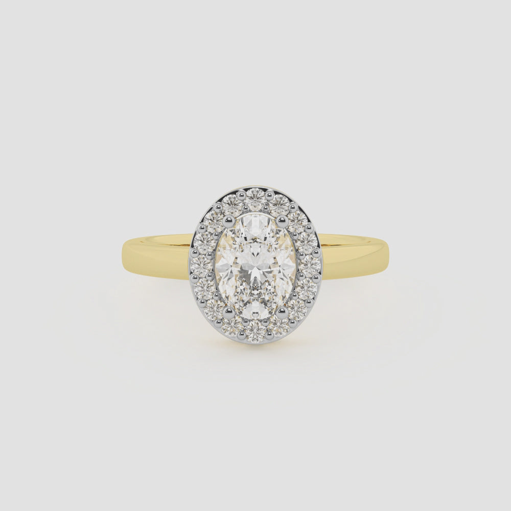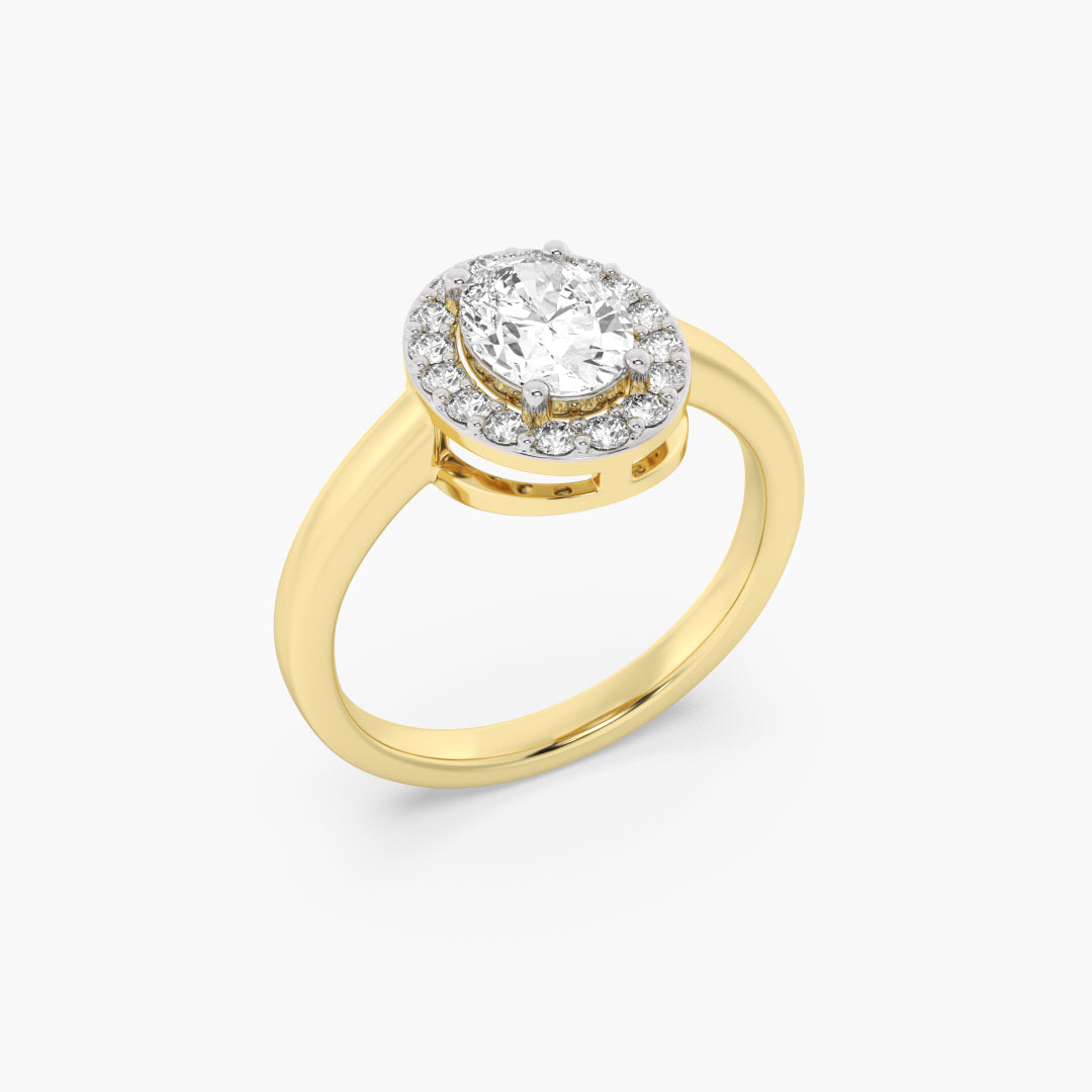A lab grown oval diamond encircled by a delicate pavé halo, set on a slender 14k rose gold band for a soft, romantic sparkle.