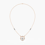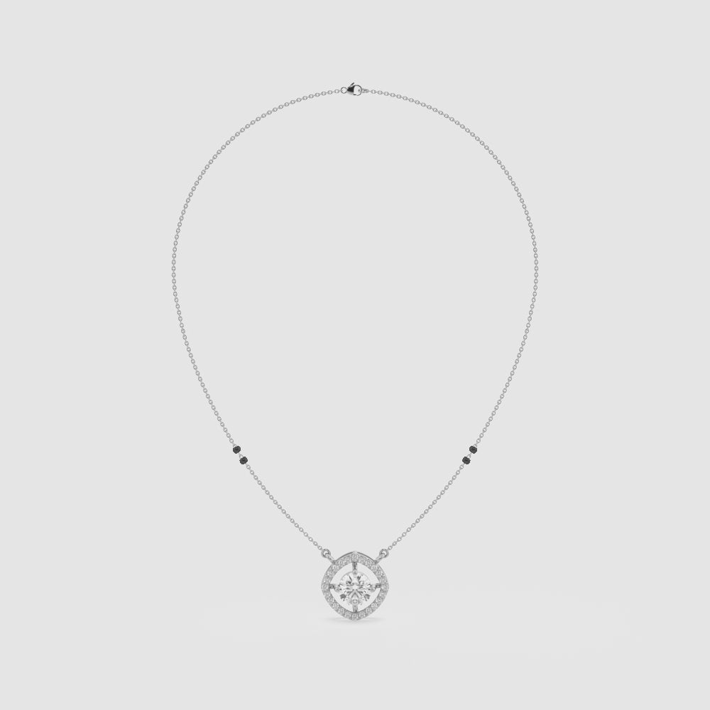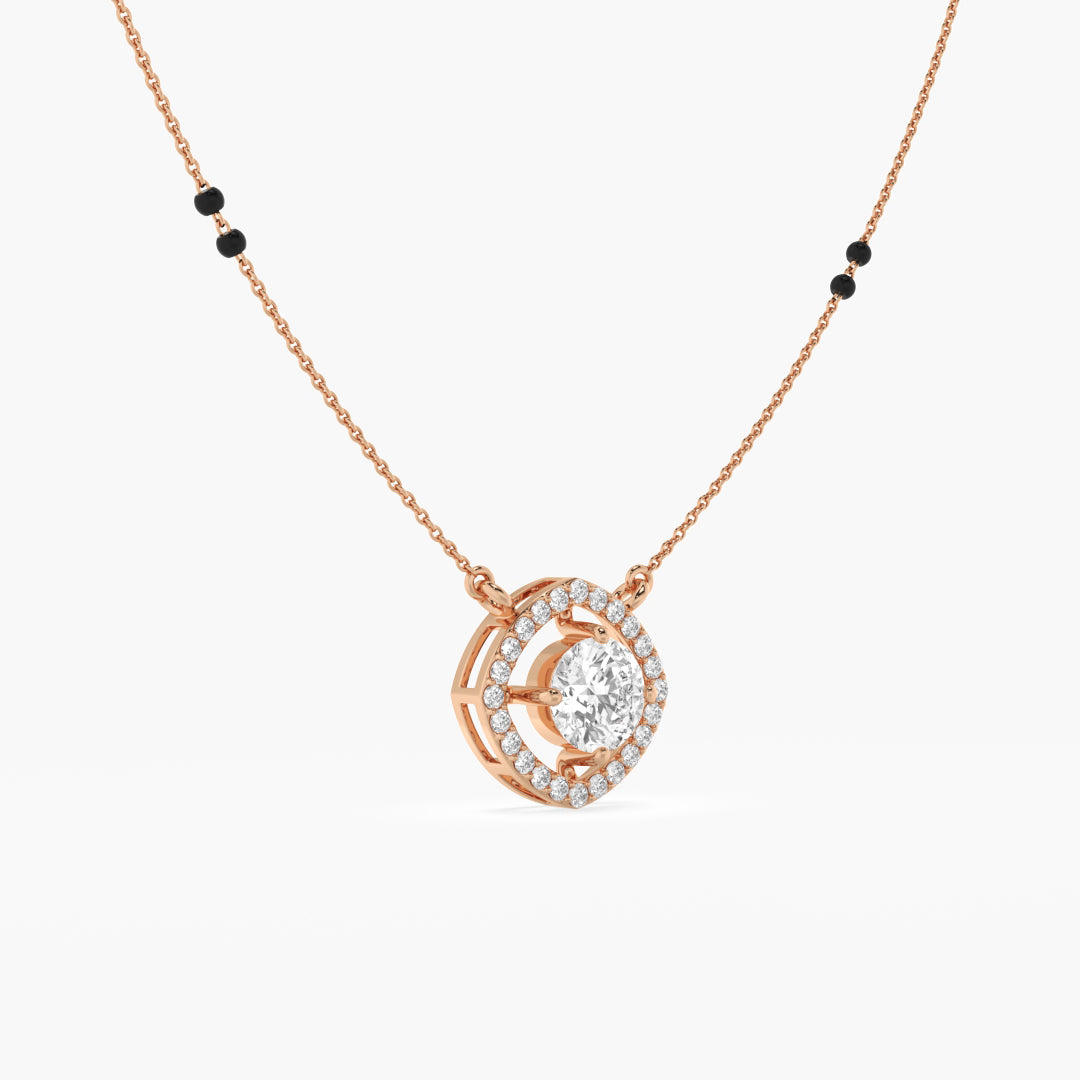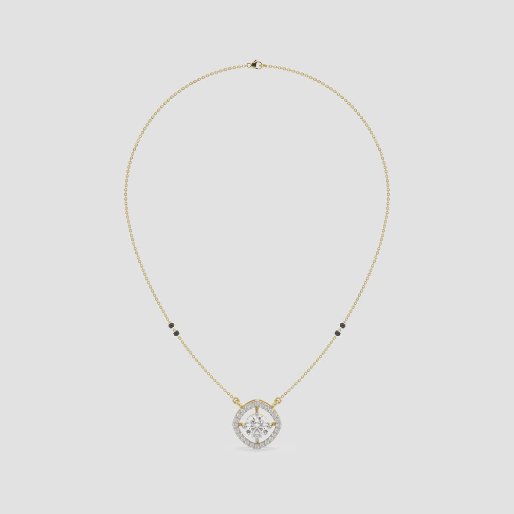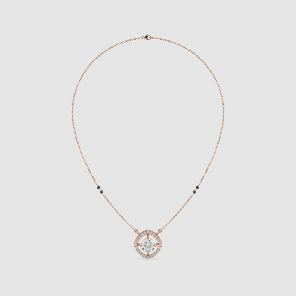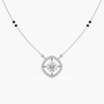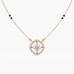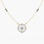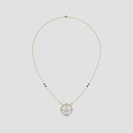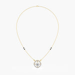 A round brilliant diamond embraced by a luminous halo, set in 14K gold and accented with traditional black beads, blending cultural heritage with contemporary elegance.