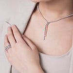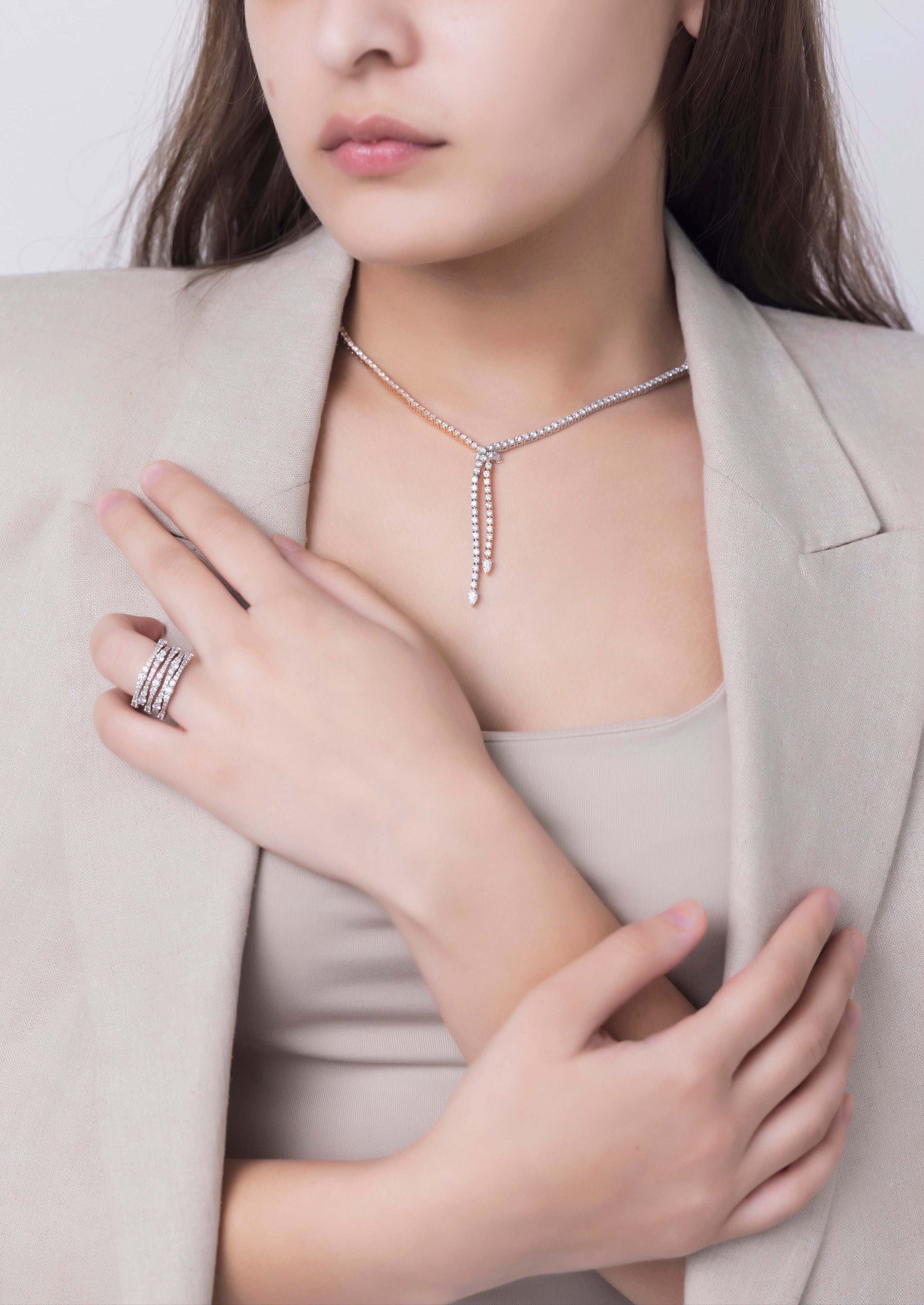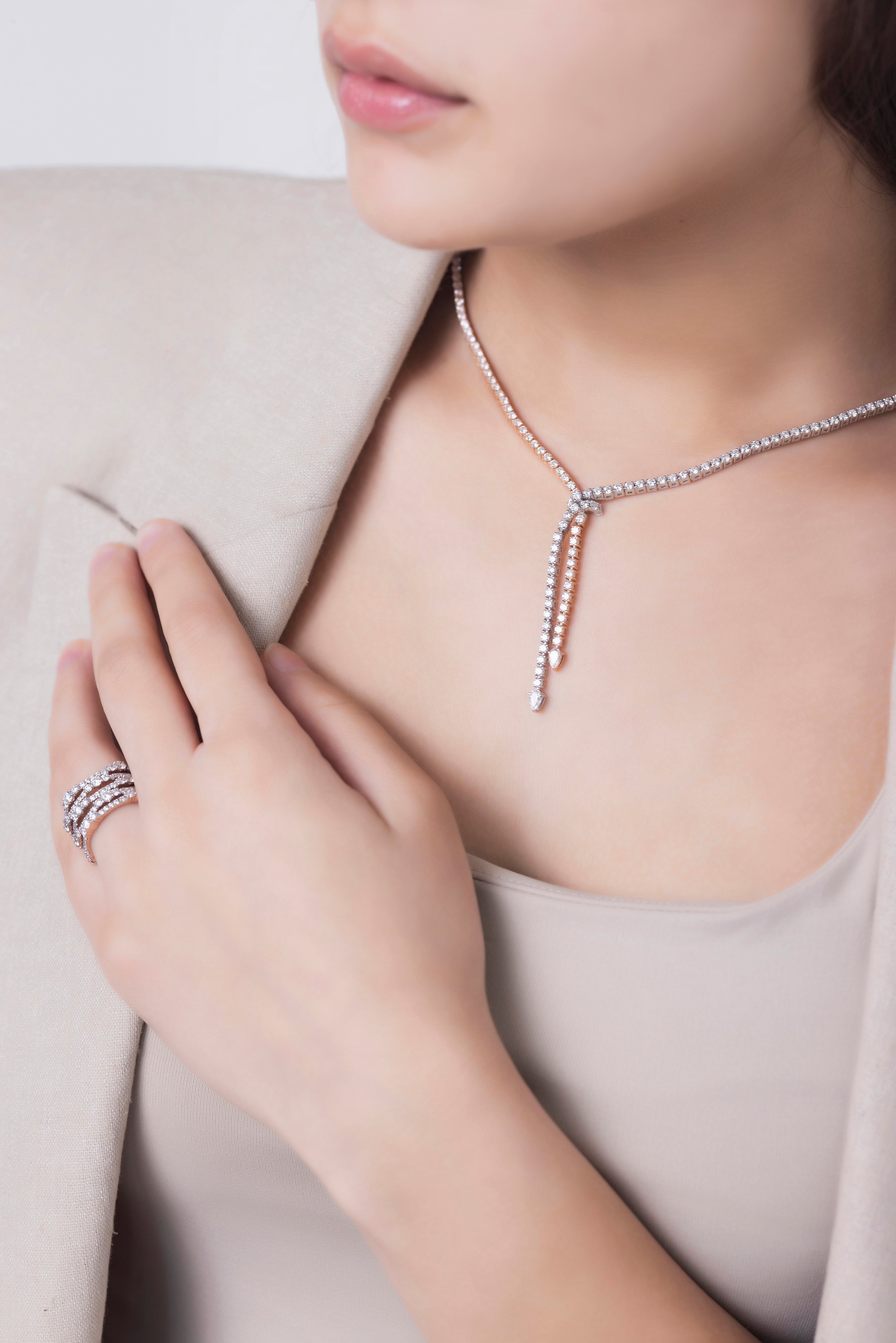 The Two-Tone Knot Lariat features pavé strands of rose and white gold, each lined with Lab grown diamonds and ending in pear and round diamond drops. A sleek knot at the center ties the look together — both literally and stylistically. It’s movement, contrast, and sparkle in perfect harmony