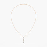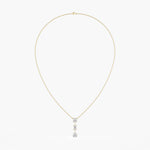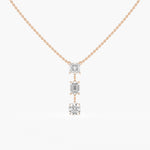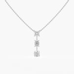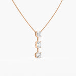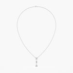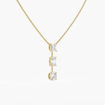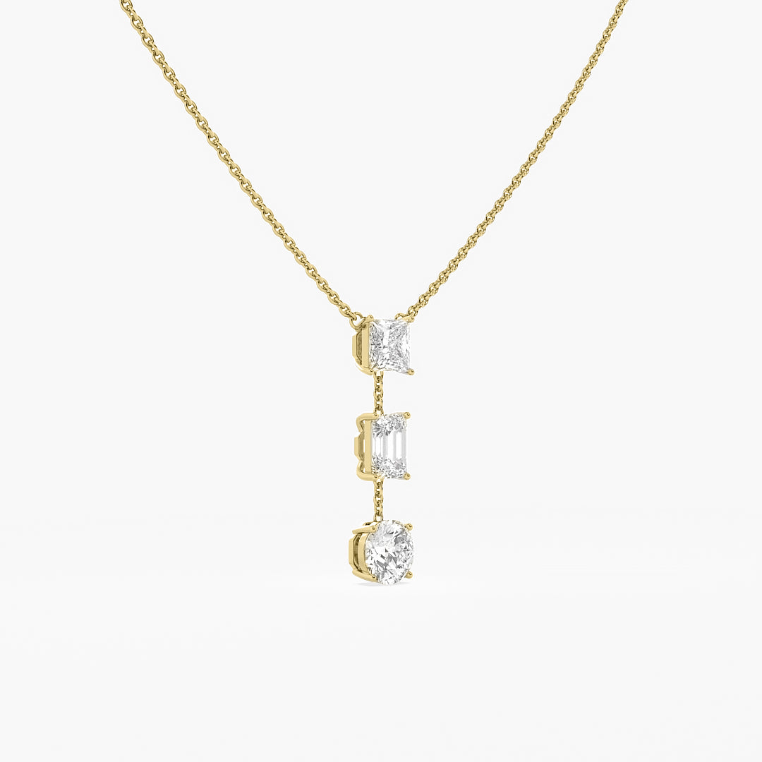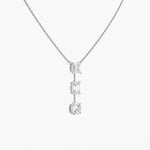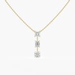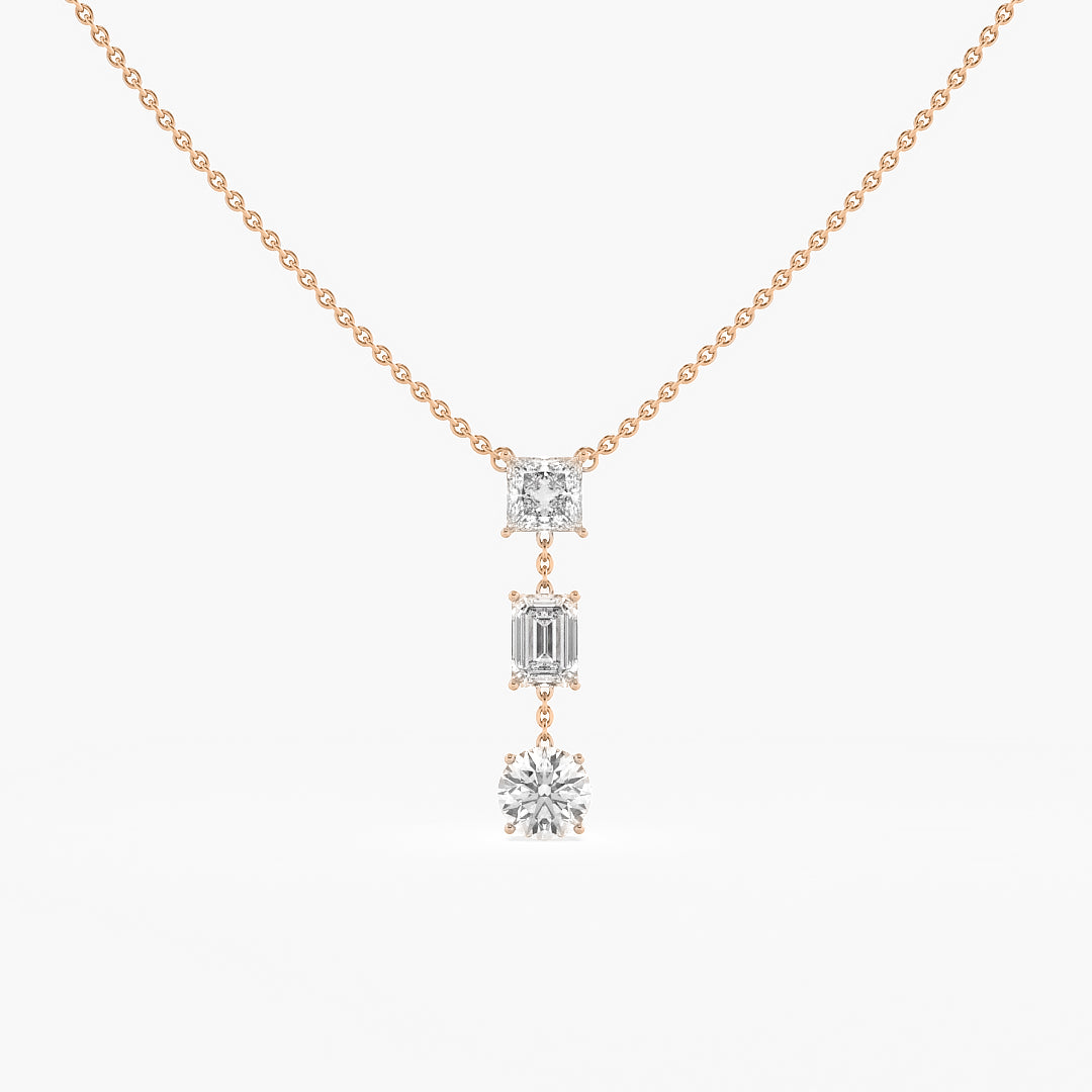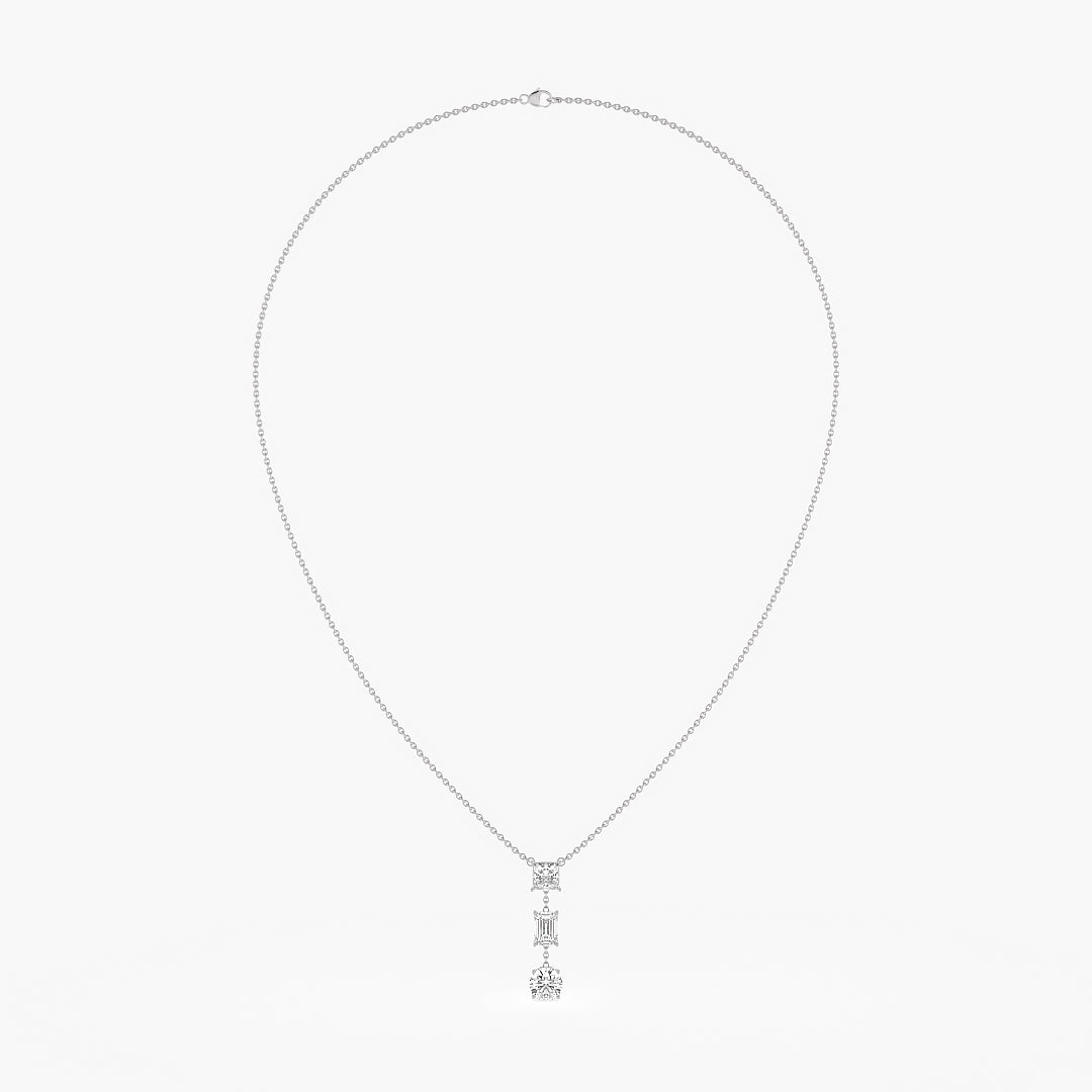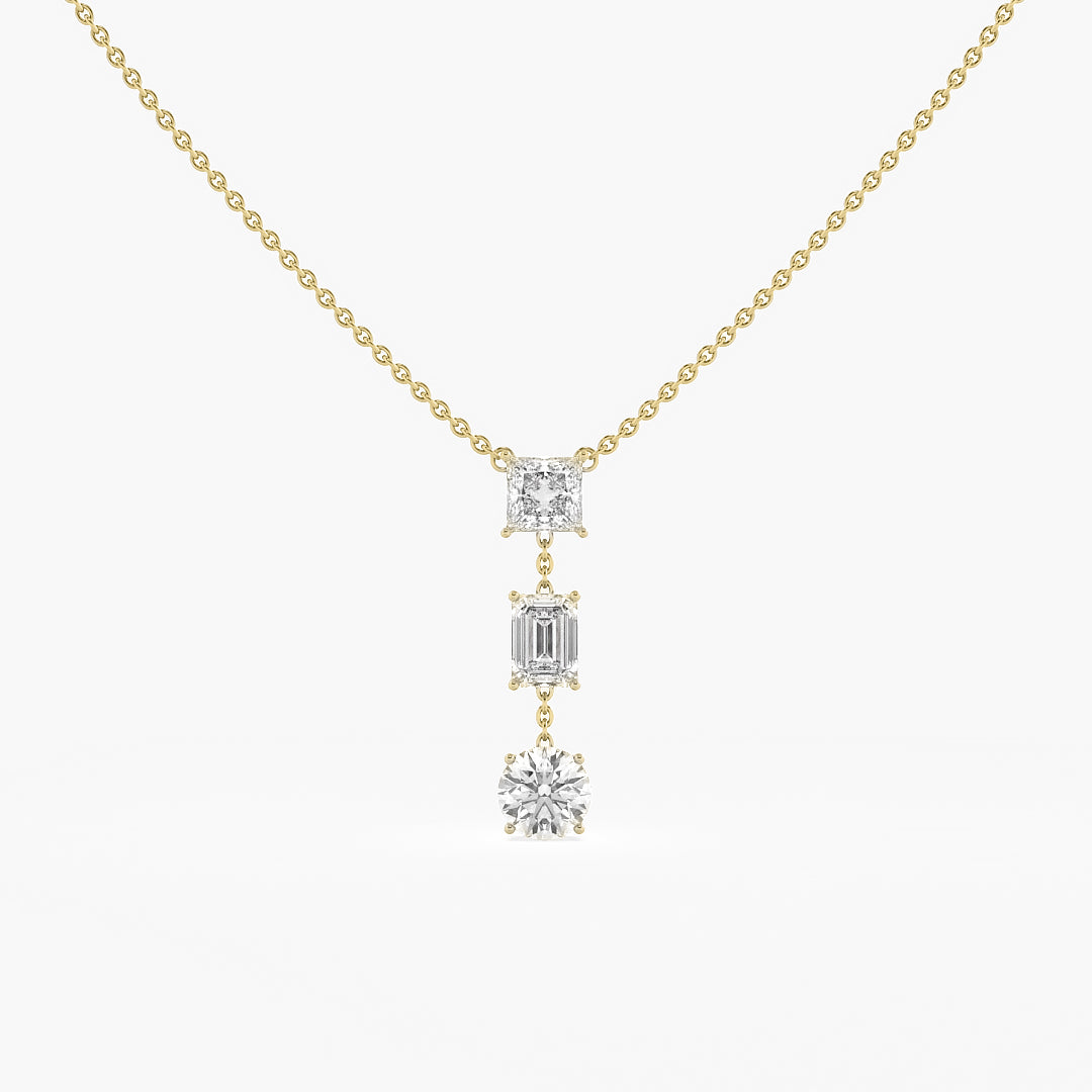 The Trinity Drop Pendant celebrates the art of contrast with a vertical trio of round, emerald, and princess-cut Lab grown diamonds, this minimalist yet eye-catching piece plays with shape and symmetry for a fresh take on the classic diamond drop. Elegant alone, striking layered.