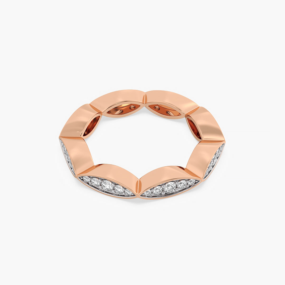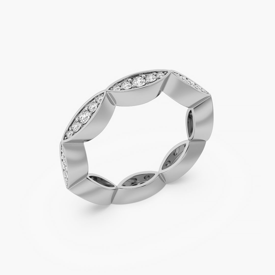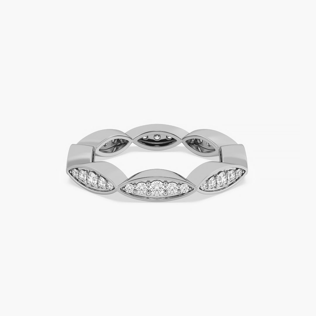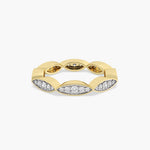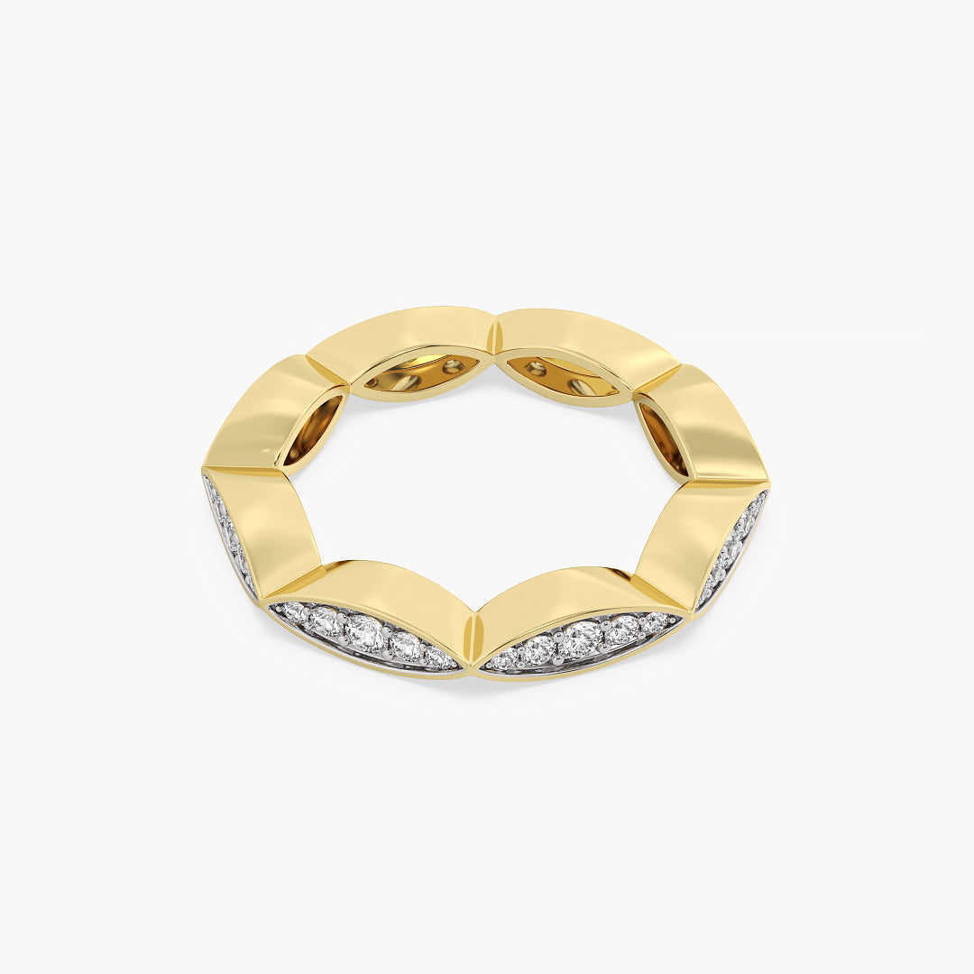 The Marquise Illusion Band features round brilliant lab-grown Lab grown diamonds expertly pavé-set in marquise-shaped gold frames, creating the illusion of larger, elongated marquise stones. Crafted in 14K yellow gold with high-polish finish, this sculptural band balances modern edge with timeless sparkle.