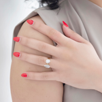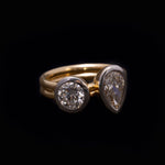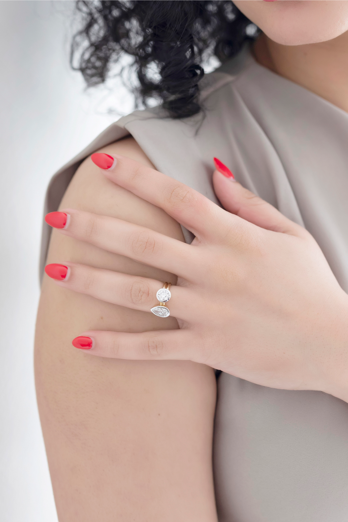 This sculptural double-band ring features a pear-shaped and a round lab-grown diamond, each bezel-set and positioned in perfect asymmetry. Crafted in solid 14K gold, it’s a fresh expression of duality: bold and soft, curved and sharp, effortless and intentional.