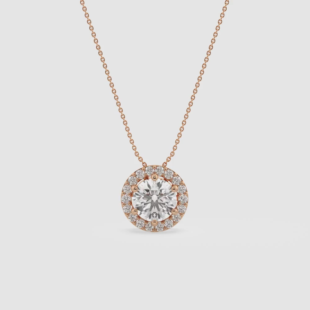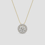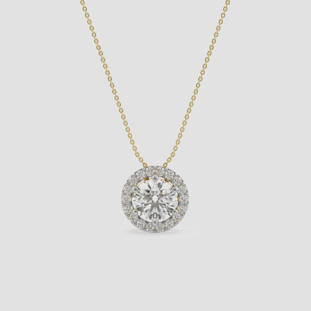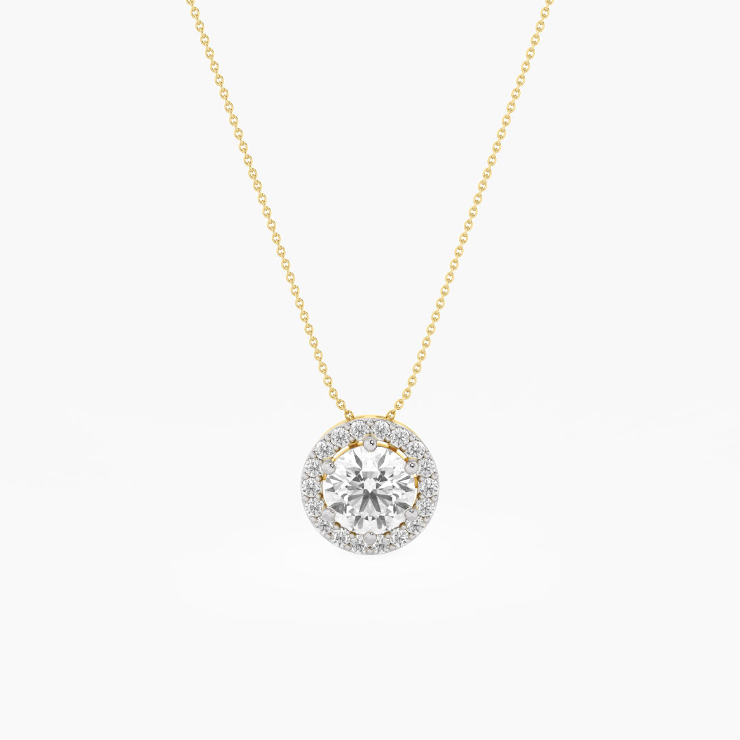 A round brilliant lab-grown diamond centerpiece, encircled by a halo of micro pavé-set diamonds in 14k gold, designed to enhance brilliance and create a radiant, timeless look.